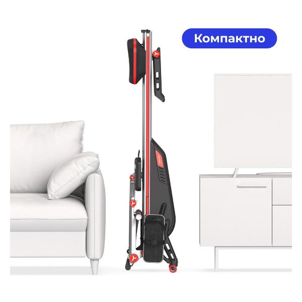 На панели размещен цифровой дисплей, показывающий основные параметры тренировки. Встроенная индикация отражает время тренировки, расход калорий, скорость, дистанцию. Устройство синхронизируется с мобильным приложением. Встроенная Bluetooth-стереосистема обеспечивает качественное и чистое звучание. Колесики для перемещения удобны для транспортировки. Питание тренажера происходит от батареи. Габаритные размеры — 91,3х52х172 см. Цвет корпуса — черно-серый. Вес равен 31 кг.