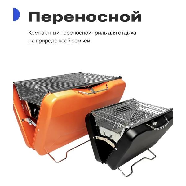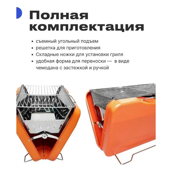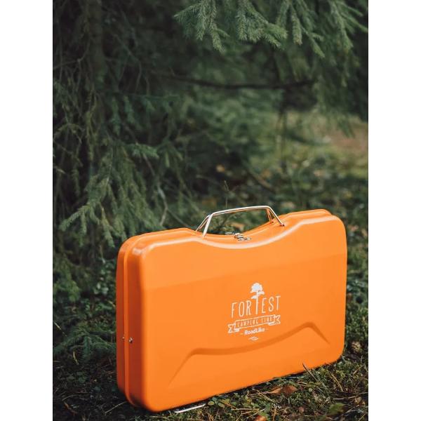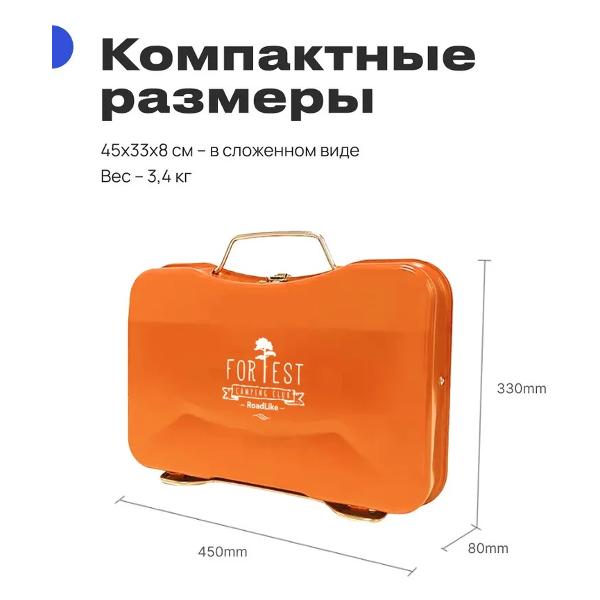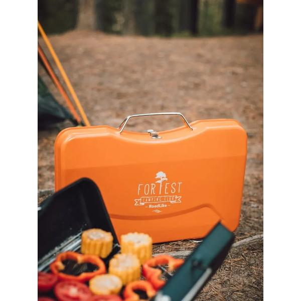 Портативный гриль RoadLike Grill Plus выполнен в форм-факторе кейса с ручкой для переноски. Предусмотрены съемный поддон для угля, решетка и складные ножки, обеспечивающие устойчивость. Корпус сделан из нержавеющей стали оранжевого цвета. Размеры в сложенном виде — 33х8х45 см, в рабочем состоянии — 30х30х45 см. Вес — 3,4 кг.