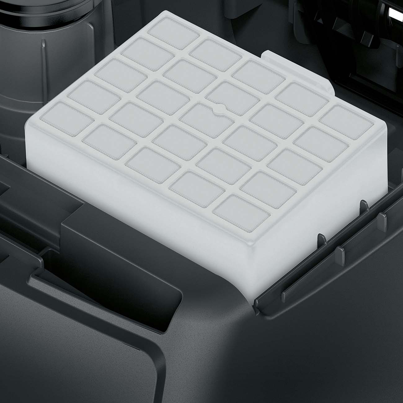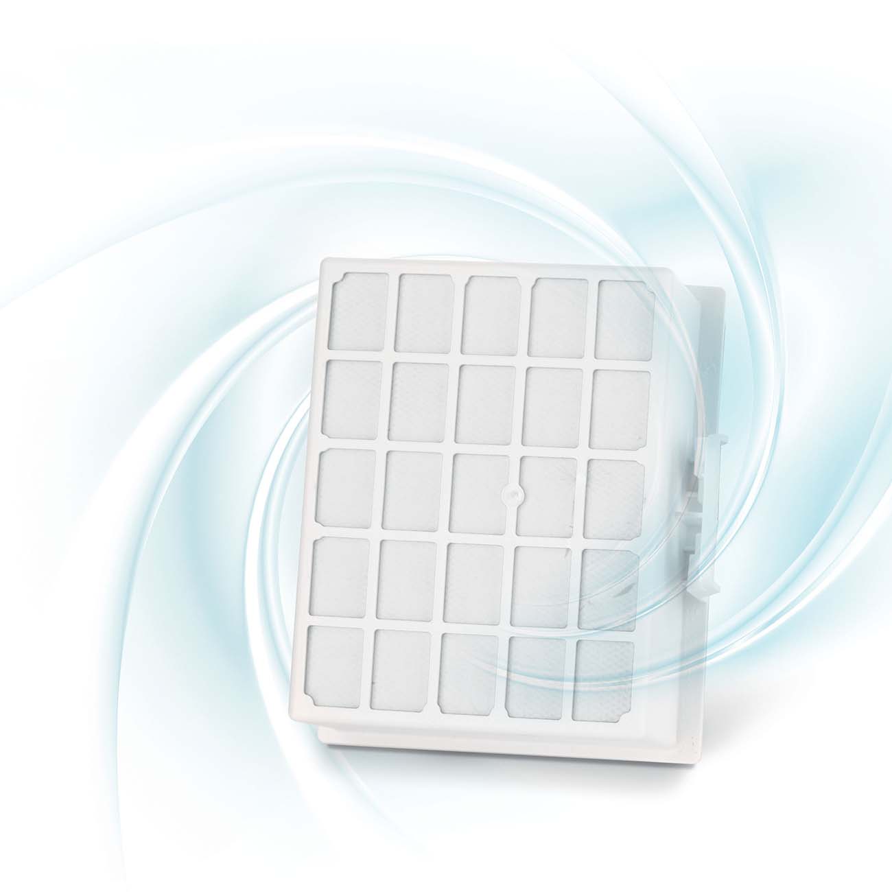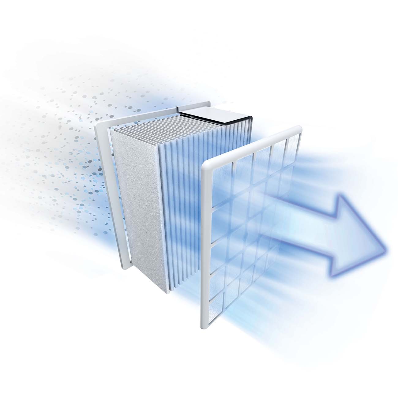 Выходной HEPA-фильтр обеспечивает надёжную очистку воздуха от практически всех видов аллергенов: спор грибов, пыльцы растений, микроскопических насекомых, частиц пыли и т. п. Для эффективной работы фильтр нужно регулярно чистить и промывать, а также при необходимости заменять.