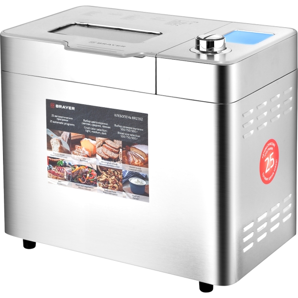 Хлебопечка Brayer 2702BR серебристого цвета обладает максимальной потребляемой мощностью 600 Вт. Модель оснащена 25 программами выпечки хлеба. Есть таймер отсроченного старта до 13 часов и режим приготовления йогурта. Вес выпечки — 500 г, 750 г, 900 г.