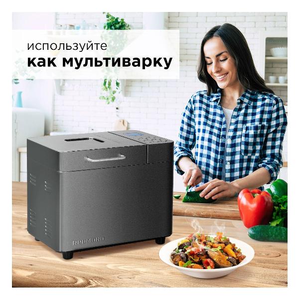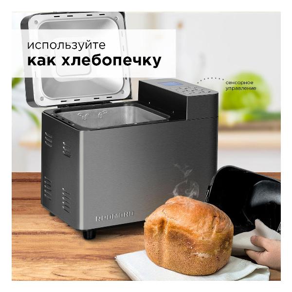 Хлебопечка Redmond RBM-M 1910 предназначена для приготовления хлеба разных сортов, включая безглютенового, теста, кексов, йогурта, каши, варенья. В памяти устройства — по 50 программ, каждую можно настроить вручную. В случае аварийного обесточивания текущий режим сохраняется в течение 15 минут. В эту модель заложены функции предварительного нагрева, выбора размера выпечки (500 г, 750 г, 1000 г), поддержания температуры.
