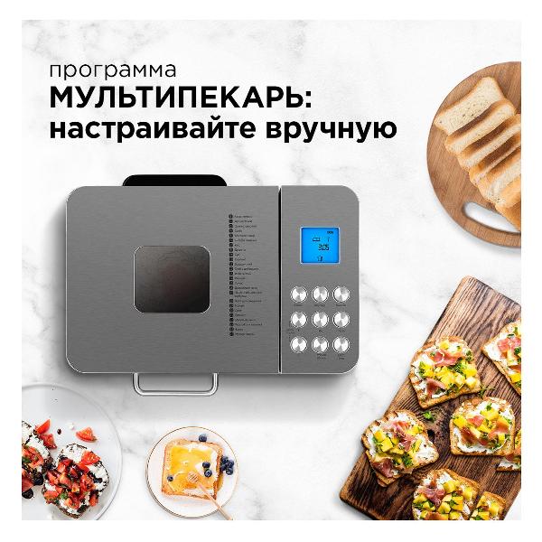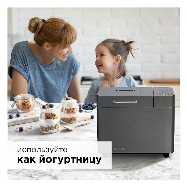 Корпус печи выполнен из нержавеющей стали. В крышку интегрировано смотровое окошко — контролировать процесс можно, не открывая прибор. В устройстве используется прямоугольная форма с антипригарным покрытием. К стенкам чаши не прилипают продукты, ее легко мыть. Управление обеспечивает сенсорная панель с цифровым экраном, на который выводится информация о выбранных настройках и этапах программы. В комплект входят мерный стакан, ложка, лопасть, книга рецептов. Габариты модели — 30,6х36,9х26,7 см, вес — 5,14 кг.