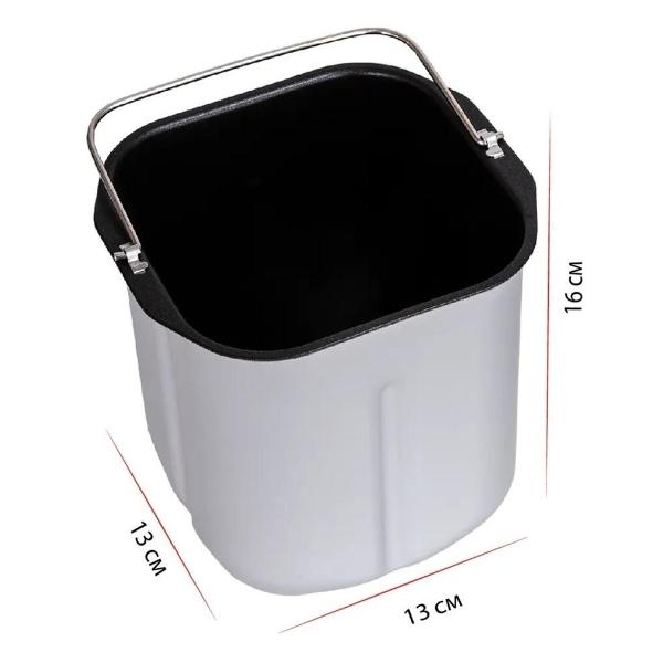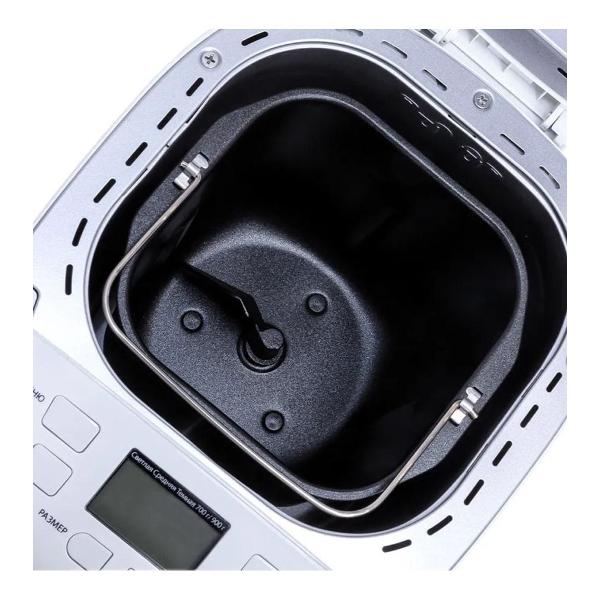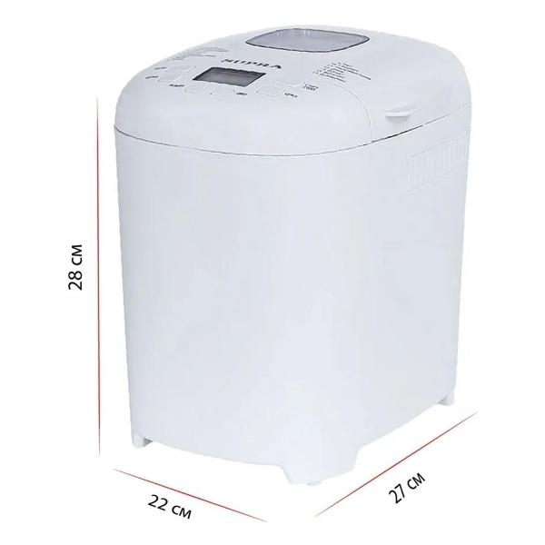 Панель управления оснащена дисплеем, на котором отражается вся информация о режиме работы, времени окончания программы. Устройство сделано из пластика, крышка оборудована смотровым окошком. Форма для выпечки прямоугольная, снимается, ее разрешено мыть в посудомоечной машине. Цвет модели — белый. Потребляемая мощность составляет 650 Вт.