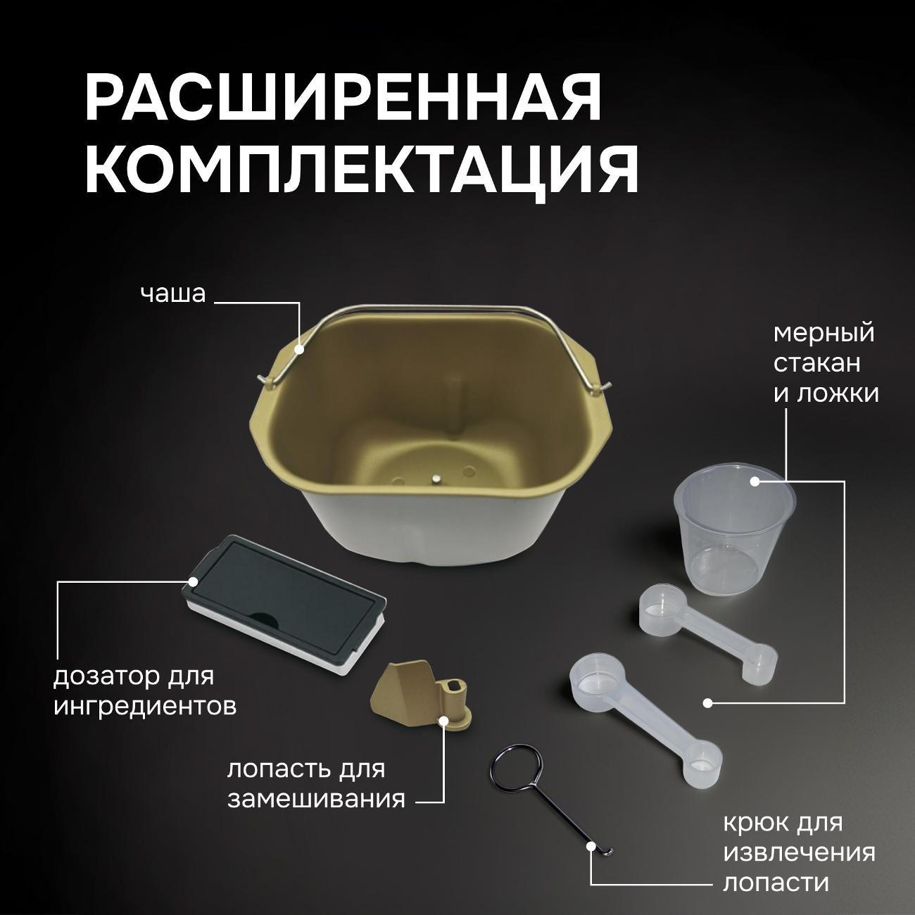 Модель оснащена 19 автоматическими программами для замешивания теста, приготовления разного вида хлеба, кексов, йогуртов, варенья. Максимальный вес получаемой выпечки составляет 1000 г. Для добавления в хлеб орехов, сухофруктов предусмотрен специальный диспенсер. Можно выбрать один из трех вариантов цвета корочки. Отложенный старт дает возможность переносить включение устройства на 15 часов. Сохранение программы при отключении питания — 10 минут. Предусмотрено поддержание температуры выпечки.