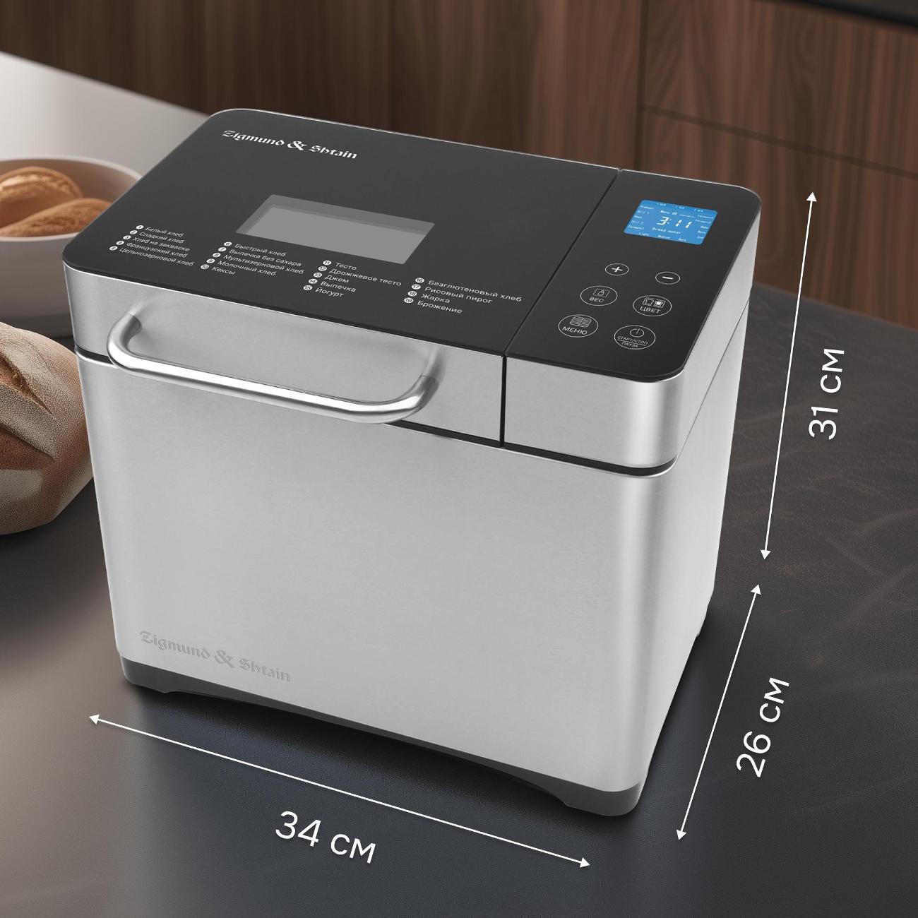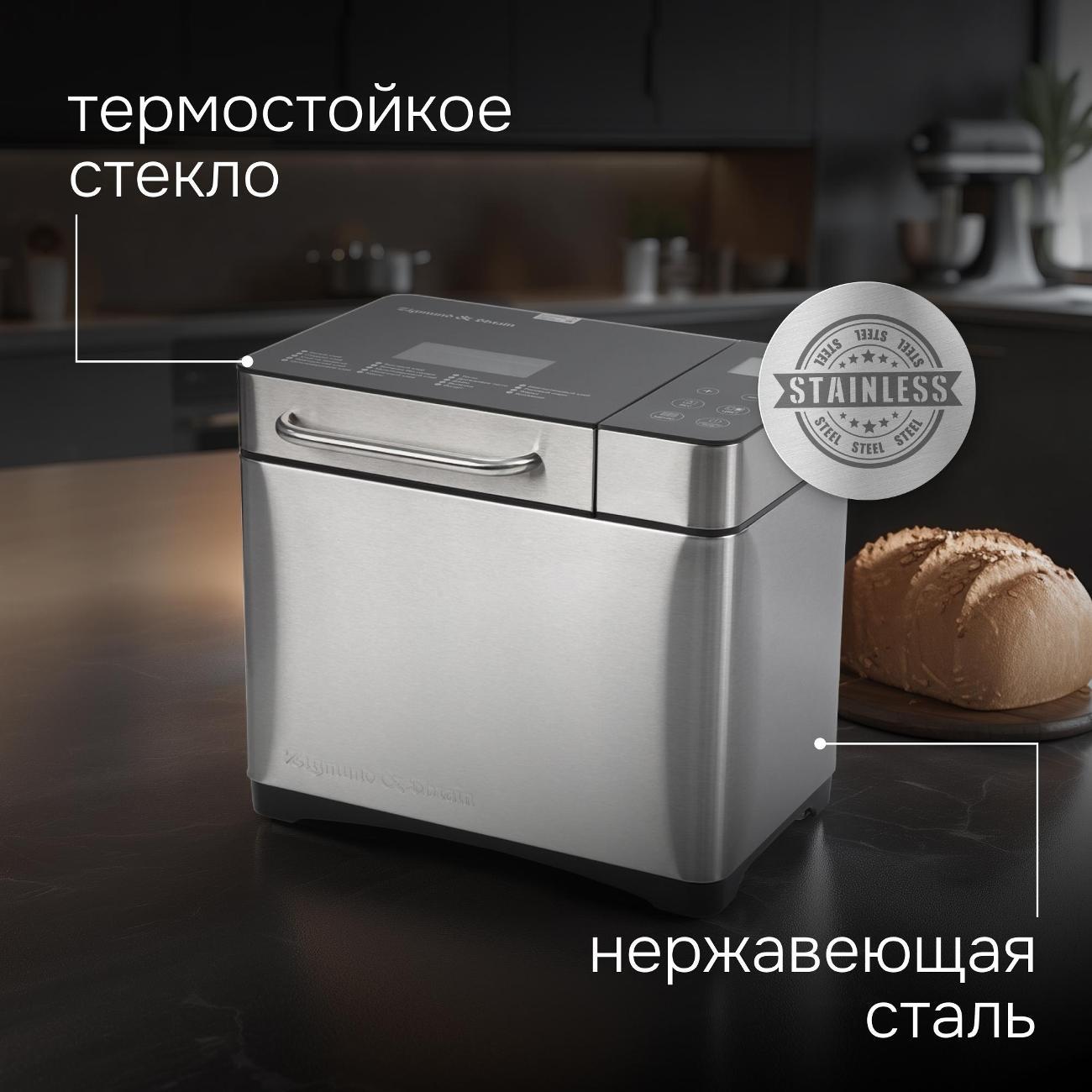 Хлебопечка Zigmund & Shtain ZBM-601 оснащена съемной прямоугольной формой с антипригарным покрытием, за счет чего уменьшается риск прилипания теста и пригорания частиц пищи. Корпус выполнен из нержавеющей стали. Благодаря прорезиненным ножкам устройство не скользит по поверхности стола. Прозрачное смотровое окно позволяет контролировать процесс готовки.