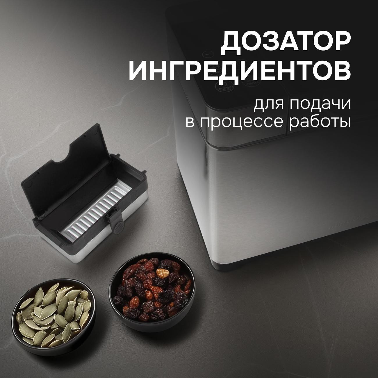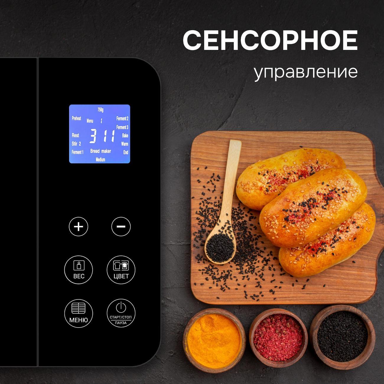 Модель оснащена сенсорной панелью управления для выбора необходимых настроек. Экранное меню выполнено в виде пиктограмм. На цифровом дисплее отображаются все основные данные. Звуковой сигнал оповещает о завершении работы. Потребляемая мощность составляет 750 Вт. В комплект входят мерная ложка и лопасть для замешивания. Длина сетевого шнура — 1 м.