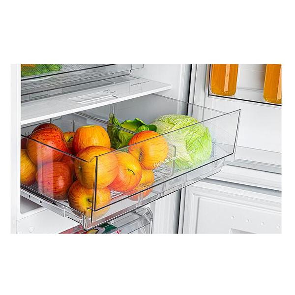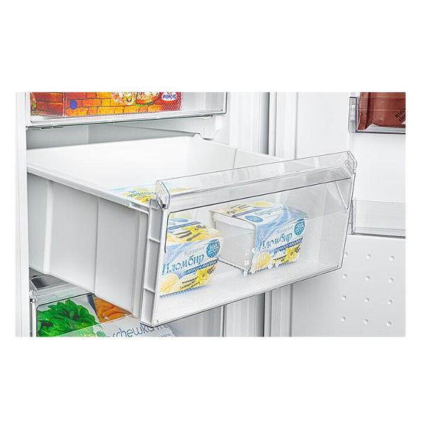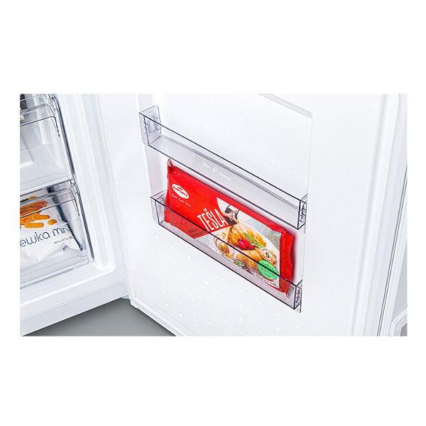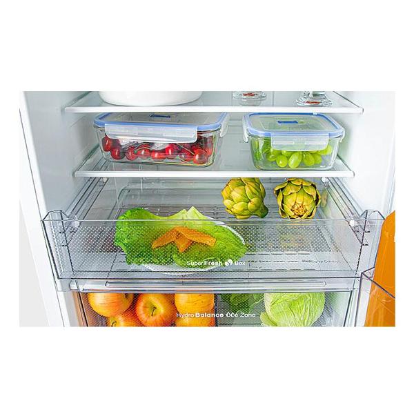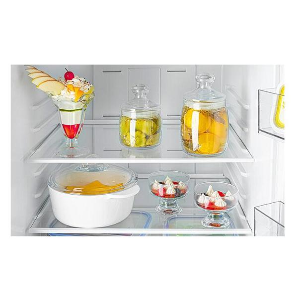 Модель оснащена функцией No Frost для размораживания холодильной камеры и отсека для заморозки. Дверца оборудована вертикальной ручкой легкого открывания. На корпусе расположен индикатор включения и электронная панель управления. Устройство способно сохранить продукты при открытой двери в течение 20 ч.