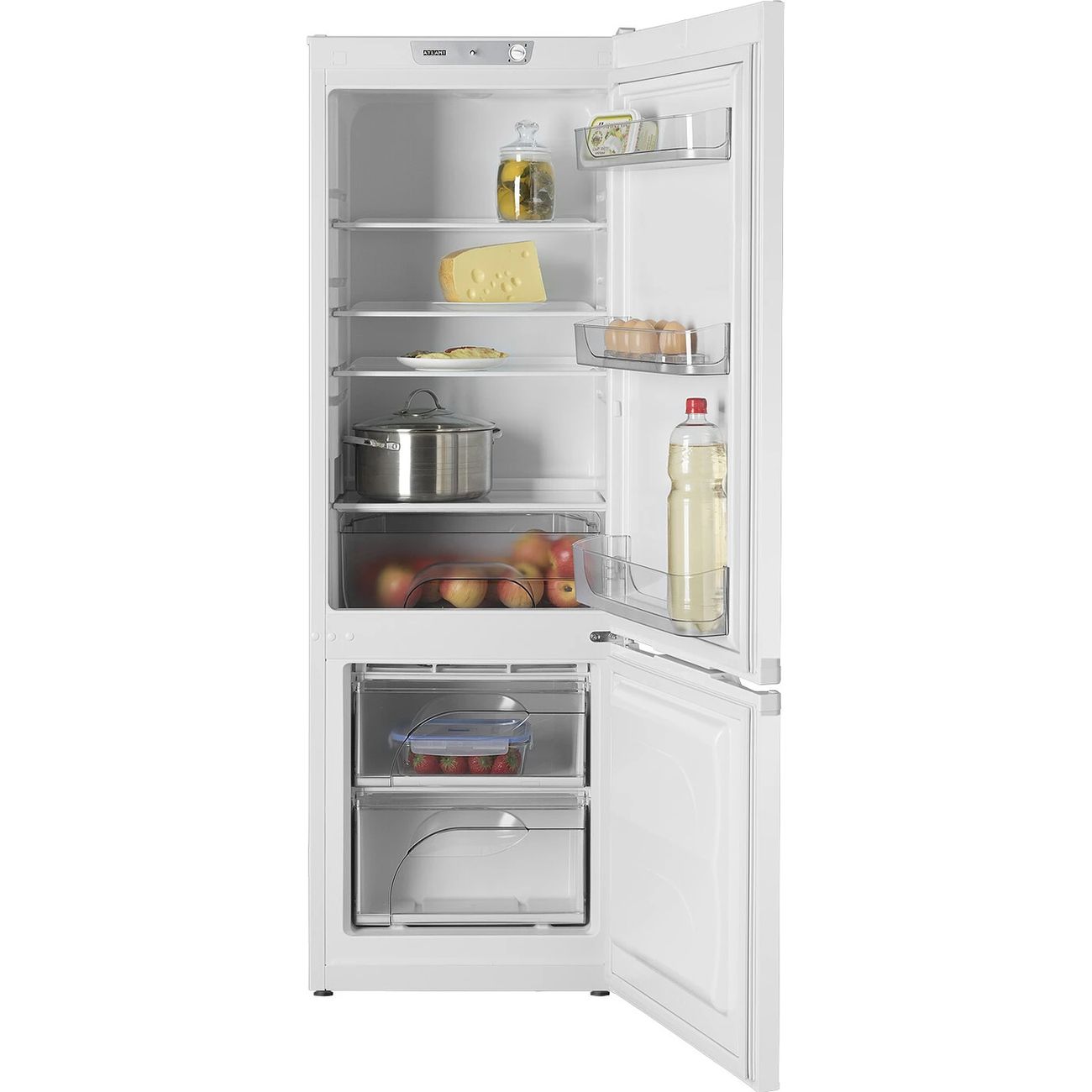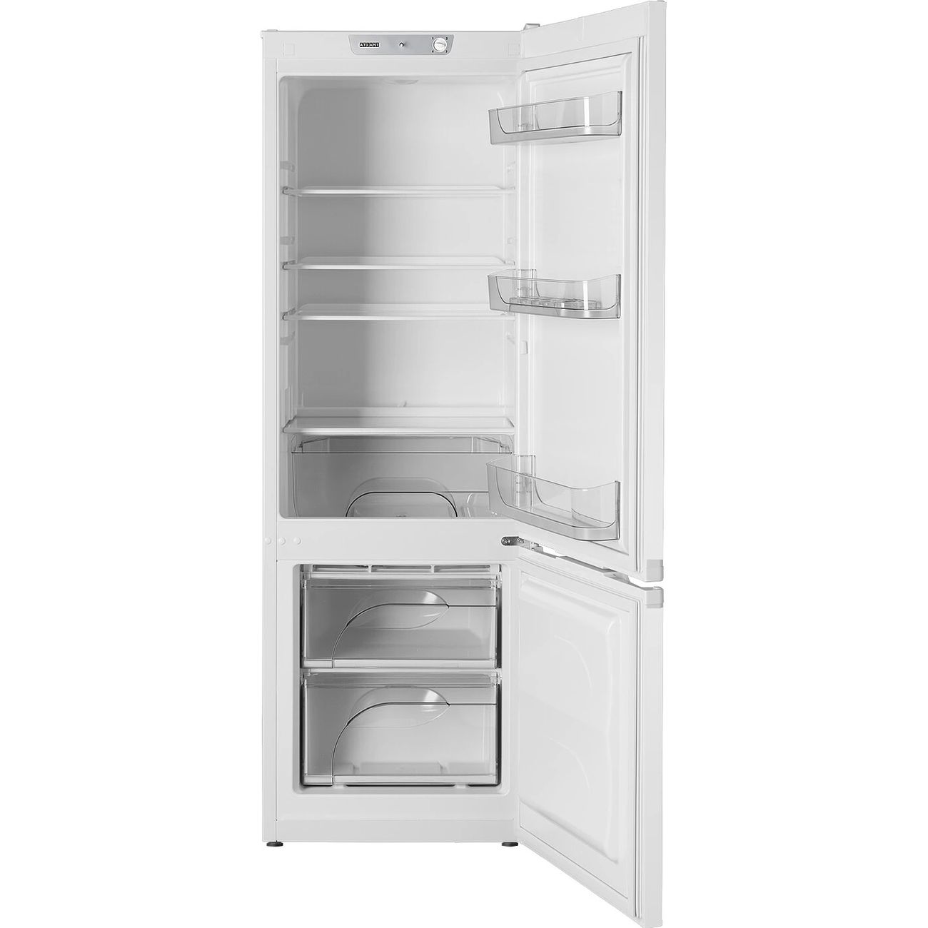 Холодильник с нижней морозильной камерой ATLANT ХМ 4209-000 белого цвета относится к узким моделям: его ширина составляет всего 54,5 см, глубина — 57,2 см, высота — 161,5 см. Общий объем этой модели равен 221 л. Энергопотребление прибора соответствует классу (276 кВт*ч в год).
