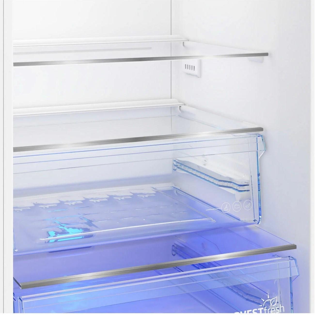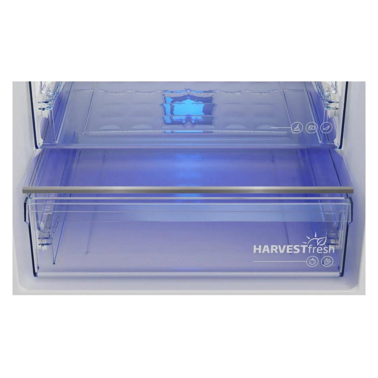 Прибор оснащен перенавешиваемыми дверцами с горизонтальными скрытыми ручками. Электронный блок управления позволяет настраивать работу каждой из камер. В этой модели установлено трехцветное освещение Harvest Fresh, которое способствует более долгой сохранности свежести овощей и фруктов.