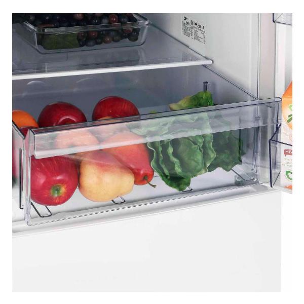 Находка для тех, кто ищет компактный, но вместительный холодильник. Нам на четырех человек хватает. Полки можно переставлять как угодно, влезает всё, что угодно, даже та огромная кастрюля, которую я никак не могла пристроить в старый холодильник. Охлаждает все отлично, есть НоуФрост, так что размораживть не приходиться и ничего не намерзает.