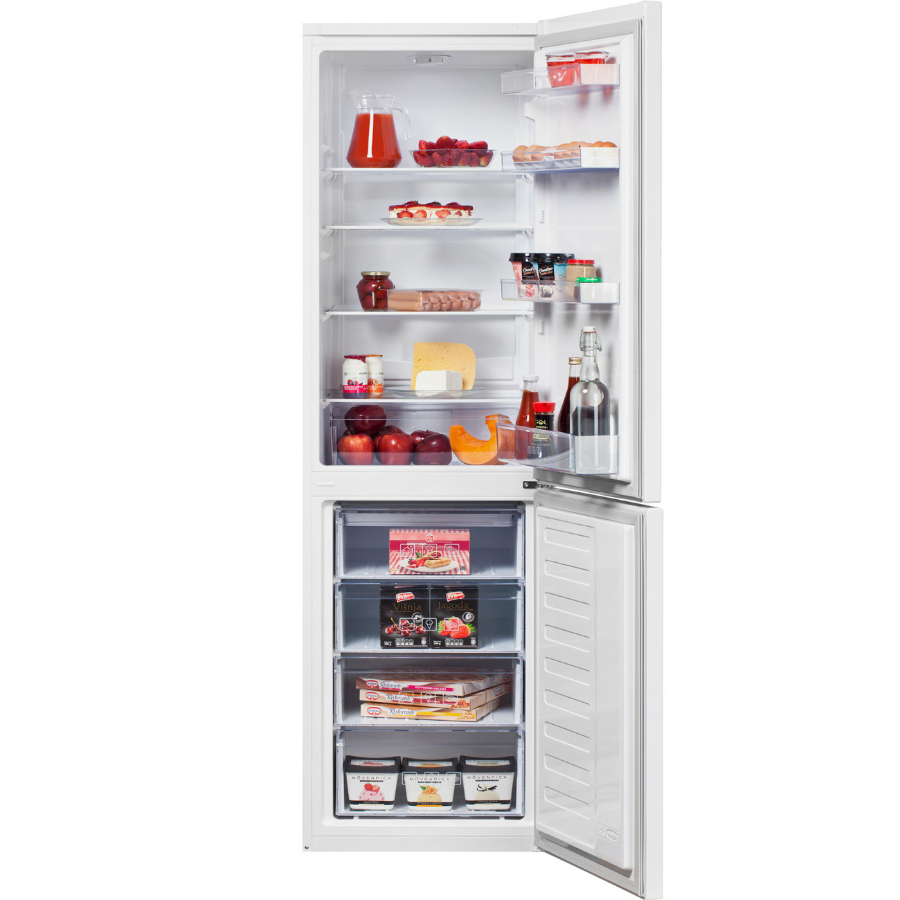 В холодильном отделении расположены четыре полки, выполненные из закаленного стекла, и столько же дверных карманов. Высокие бортики нижнего позволяют хранить в нем пакеты и бутылки с напитками. Для фруктов и овощей есть пластиковый контейнер. Оснащение морозилки состоит из четырех ящиков, мощность замораживания — 7 кг в сутки. Уровень охлаждения регулируется механическим поворотным переключателем.