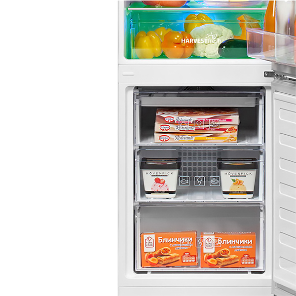 Производительность по замораживанию достигает 5 кг/сутки. Морозильная камера на 76 л оснащена тремя вместительными пластиковыми контейнерами. Применена система размораживания No Frost. Установлена звуковая сигнализация отрытой двери. Предельный показатель потребляемой мощности равен 282 кВт*ч. В случае отключения питания холодильник способен поддерживать низкую температуру в рабочей зоне на протяжении 18 часов.