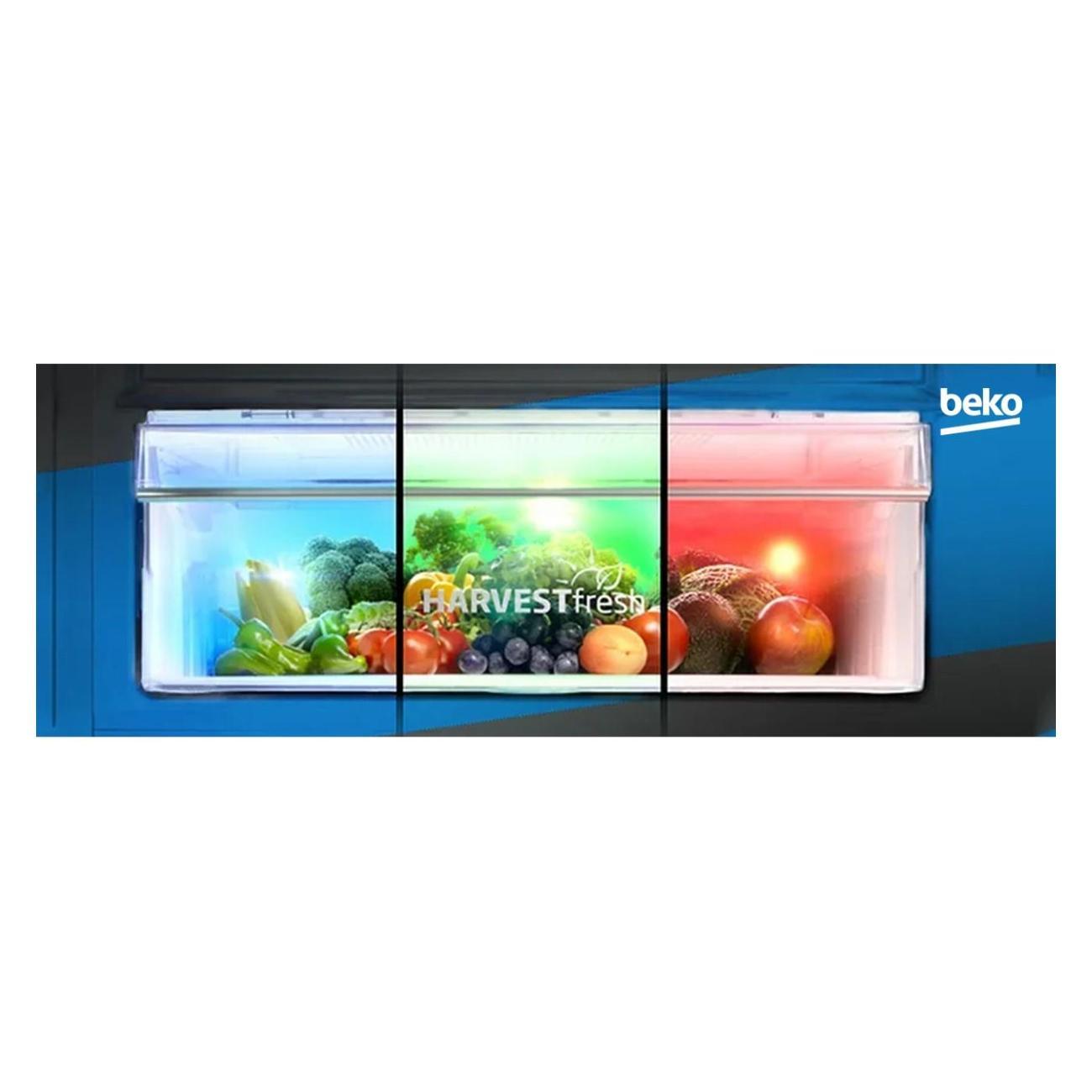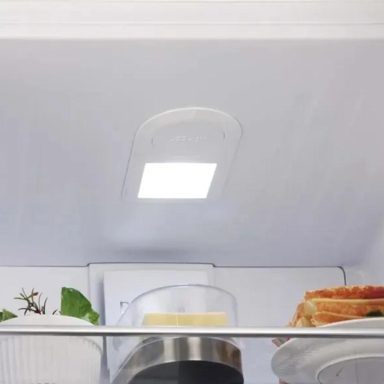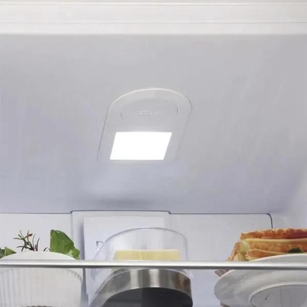 В морозилке продукты размещаются в четырех пластиковых контейнерах разного размера. Мощность замораживания достигает 7 кг/сут. При отключении электроэнергии содержимое можно хранить в течении 18 часов. Размораживание холодильной и морозильной камер происходит автоматически с помощью системы No Frost. Перенавешиваемые металлические двери снабжены внутренними горизонтальными ручками.