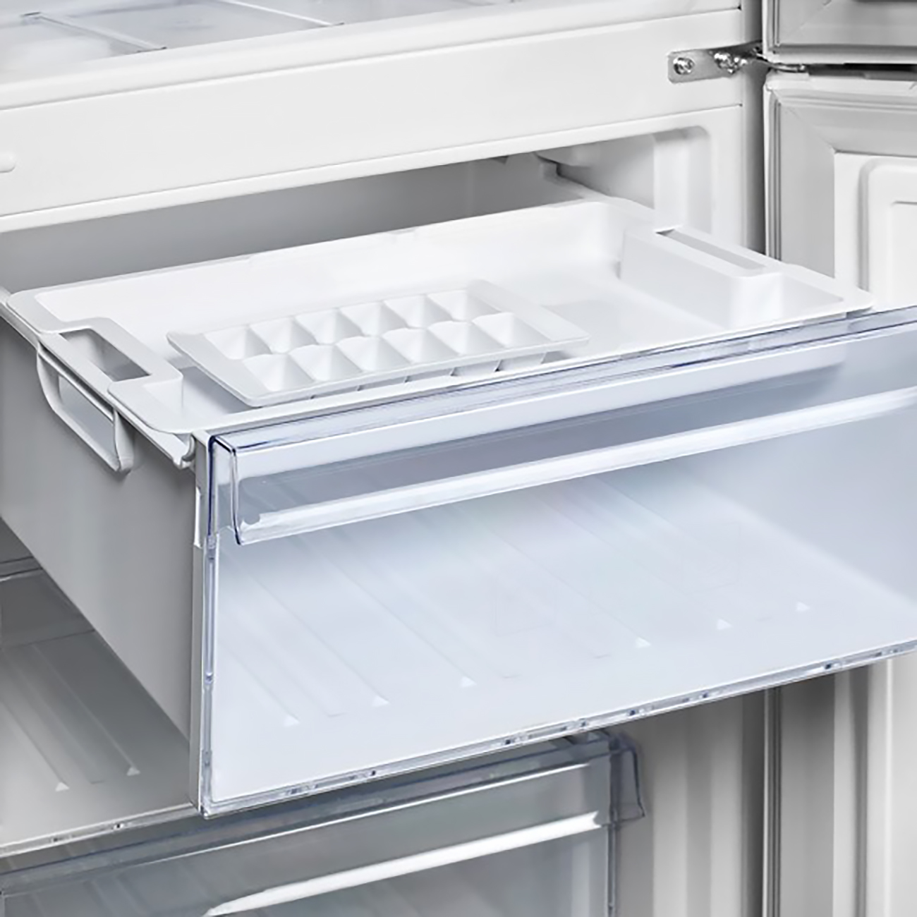 Уровень шума холодильника в процессе работы равен 40 дБ. В комплекте с устройством идет формочка для льда и подставка для яиц. Объем холодильной камеры составляет 213 л, основная часть полок выполнена из стекла. Ящики сделаны из прочного пластика. Снизу установлен вместительный морозильный отсек на 87 л, производительность которого достигает 5 кг/сутки. Металлические двери оснащены пластиковым покрытием, которое легко поддается чистке.