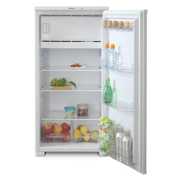 Холодильник с верхней морозильной камерой «Бирюса» 10 произведен в России. Мощность замораживания — 1,5 кг/сутки. Работа устройства обеспечивается стандартным компрессором. Размораживание — капельное и ручное. Перенавешиваемая металлическая эмалированная дверь размещает внутри 4 пластиковые полки, открывается направо с использованием внутренней ручки.