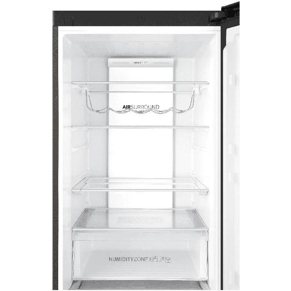 Холодильная камера (286 л) оснащена тремя стеклянными полками, одна из которых складывается, что позволит адаптировать пространство под текущие нужды. Четвертая полка служит крышкой контейнера HumidityBox, в котором за счет респираторной мембраны HCS поддерживается оптимальный уровень влажности — бокс предназначен для фруктов, овощей, зелени. Под ним расположено регулируемое отделение MyZone (0°C) для хранения охлажденного мяса, рыбы, полуфабрикатов или молочных продуктов. На двери — четыре кармана, прилагается подвес для бутылок.