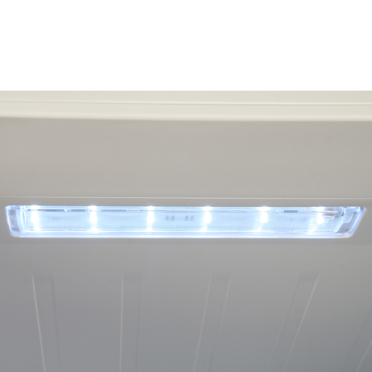 Оборудование холодильной камеры (256 л) состоит из пяти стеклянных полок, из которых четыре переставляются по высоте, и двух контейнеров, один из которых зона свежести (21 л) для фруктов и овощей. На дверце — четыре кармана. Прилагается металлическая полка для горизонтального хранения бутылок. Светодиодная подсветка создает прекрасный обзор содержимого и не оказывает влияния на внутренний микроклимат.