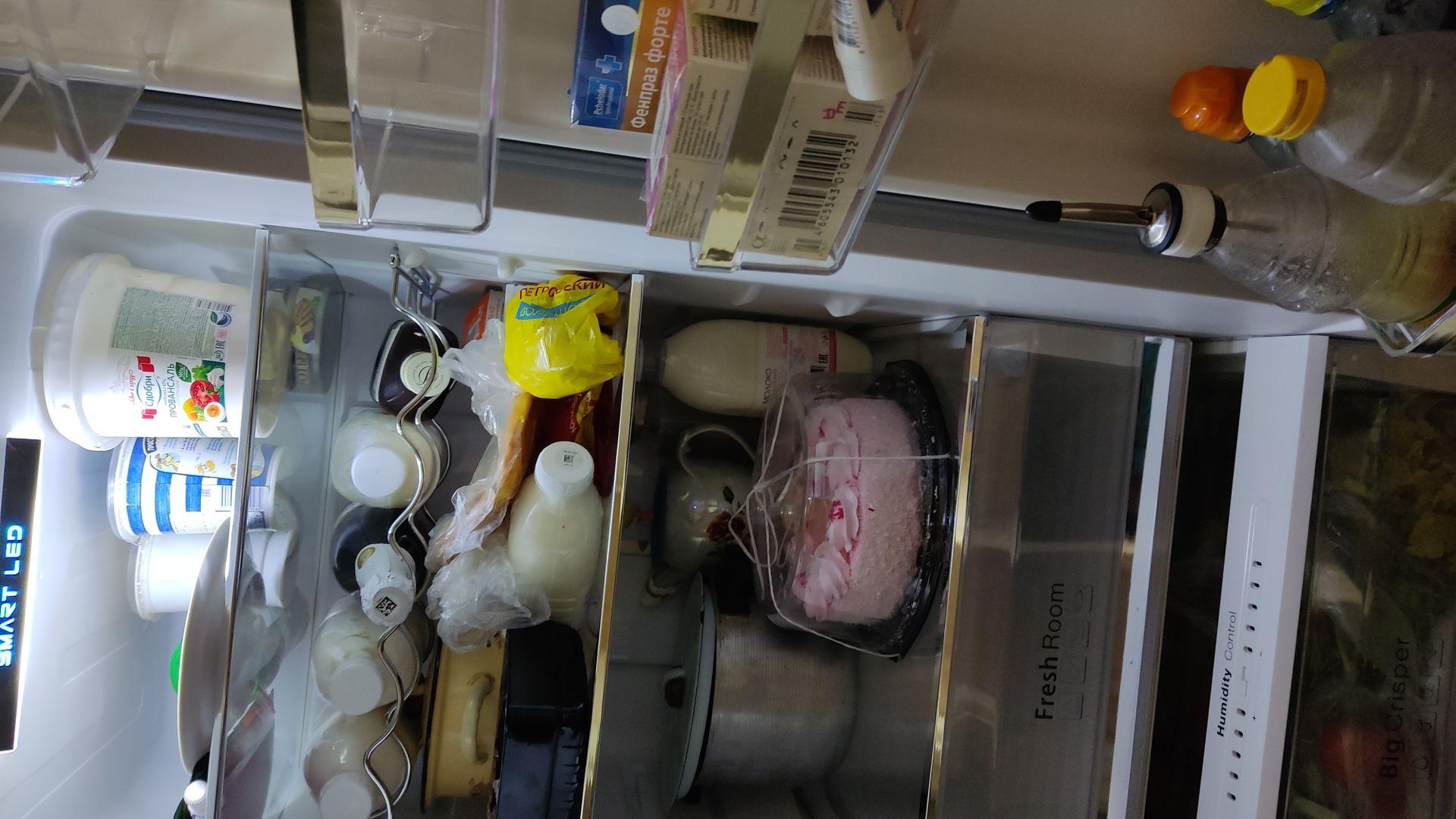 В данном холодильнике больше плюсов: No Frost (сам размораживается в двух секциях), много полок внутри и на дверке. Полки можно переставлять и направляющие расположены правильно для грамотного распределения пространства. В том моменте очень помогает полка для бутылок, освобождая низ полки. Эта полка может удержать даже малые объемы бутылок в 500мл. Не все подобные полки сконструированы так удобно! Работает тихо. Выглядит так, что все ему делают комплименты. Вместительный, почти как двухдверный холодильник.