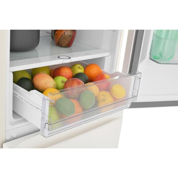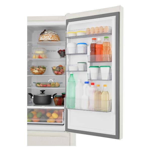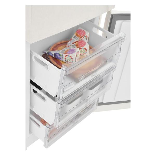 Холодильная камера оборудована пятью стеклянными полками, из которых четыре переставляются по высоте, контейнером для овощей и фруктов и шестью дверными карманами. Используется яркое и экономичное светодиодное освещение. В морозильной камере — три выдвижных ящика, в сутки можно заморозить до 9 кг продуктов.