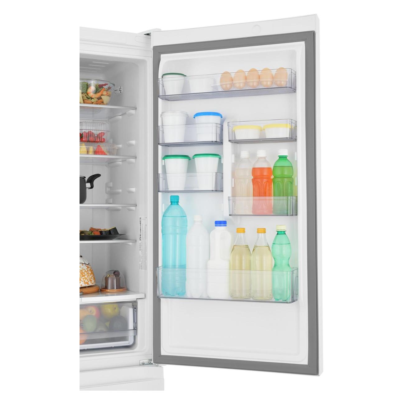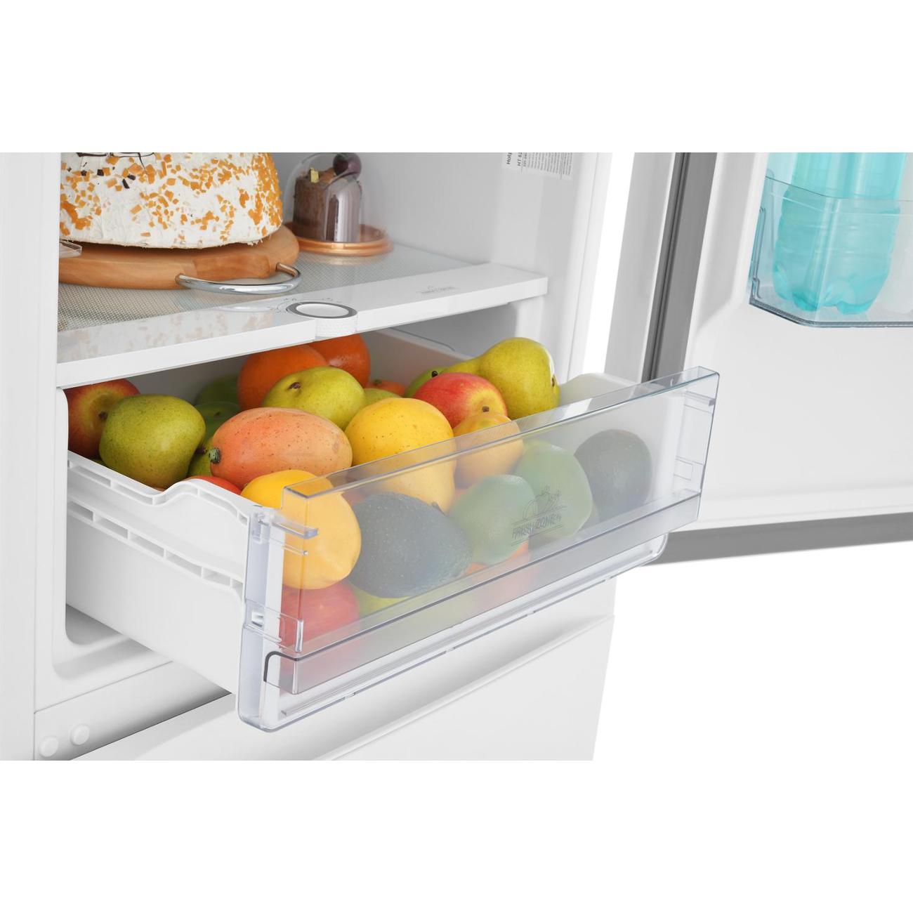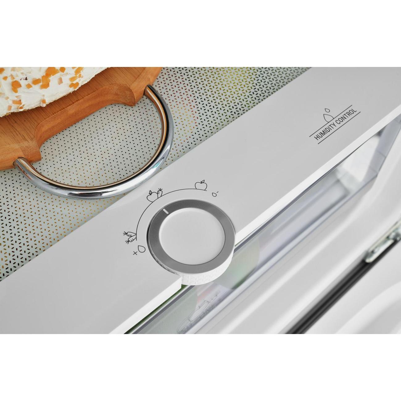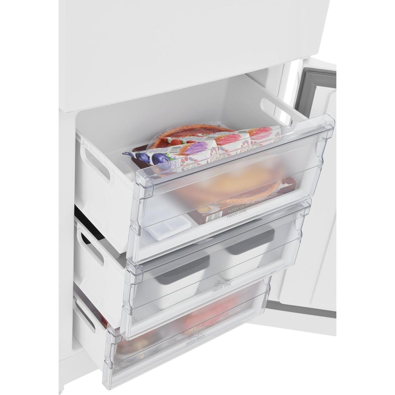 Холодильная камера оборудована пятью стеклянными полками, из которых четыре переставляются по высоте, контейнером для овощей и фруктов и шестью дверными карманами. Используется яркое и экономичное светодиодное освещение. В морозильной камере — три выдвижных ящика, в сутки можно заморозить до 9 кг продуктов.