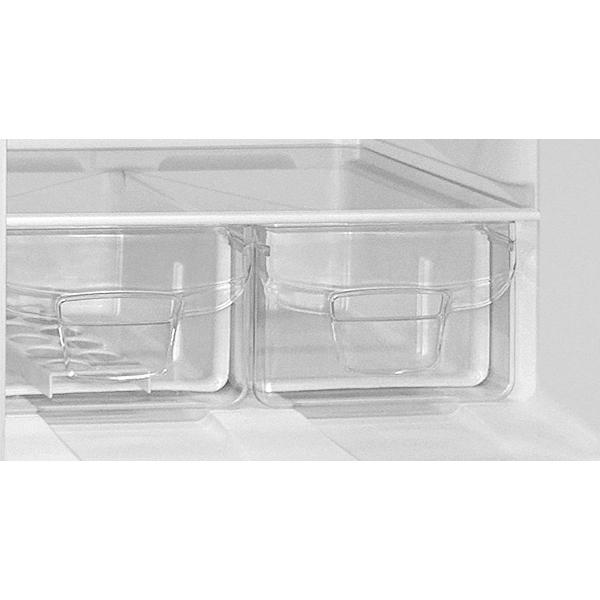 Внутри находятся четыре полки из прочного закаленного стекла, пластиковые балконы на двери для размещения бутылок и банок, отделение для фруктов и овощей. Система размораживания — капельная, что препятствует образованию наледи на стенках.