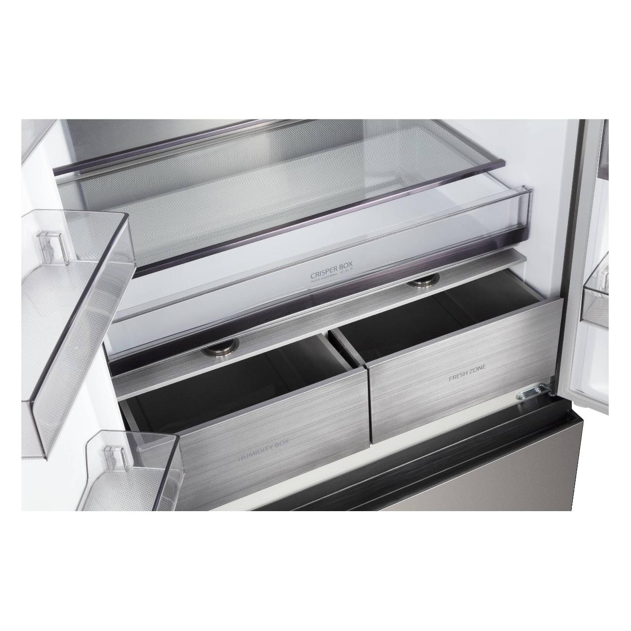 Многодверный холодильник Korting KNFF 82535 X оборудован камерой для хранения охлажденных продуктов емкостью 354 л и морозильной камерой на 186 л. В первой расположены две полки, шесть полок на дверце и три ящика в отделении для овощей. Предусмотрено наличие специальной зоны свежести, в которой можно отдельно регулировать уровень температуры и влажности. Морозильная камера включает в себя два ящика и контейнер для льда. Мощность замораживания составляет 8,5 кг продукции в сутки. Для разморозки камер применяется система No Frost.