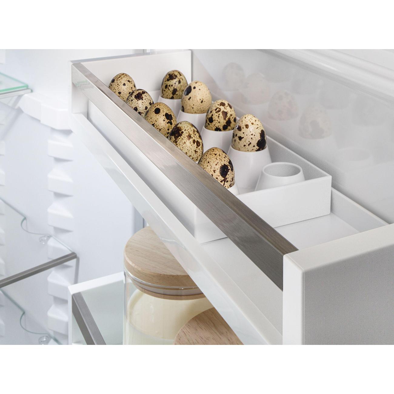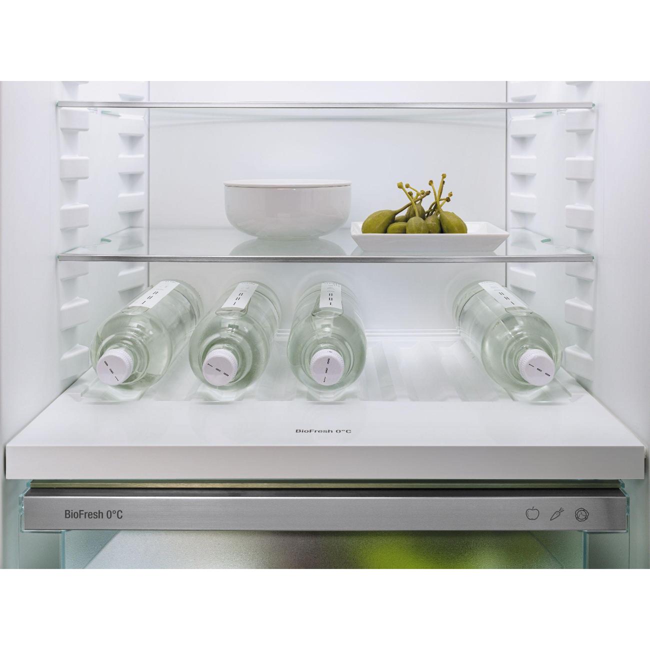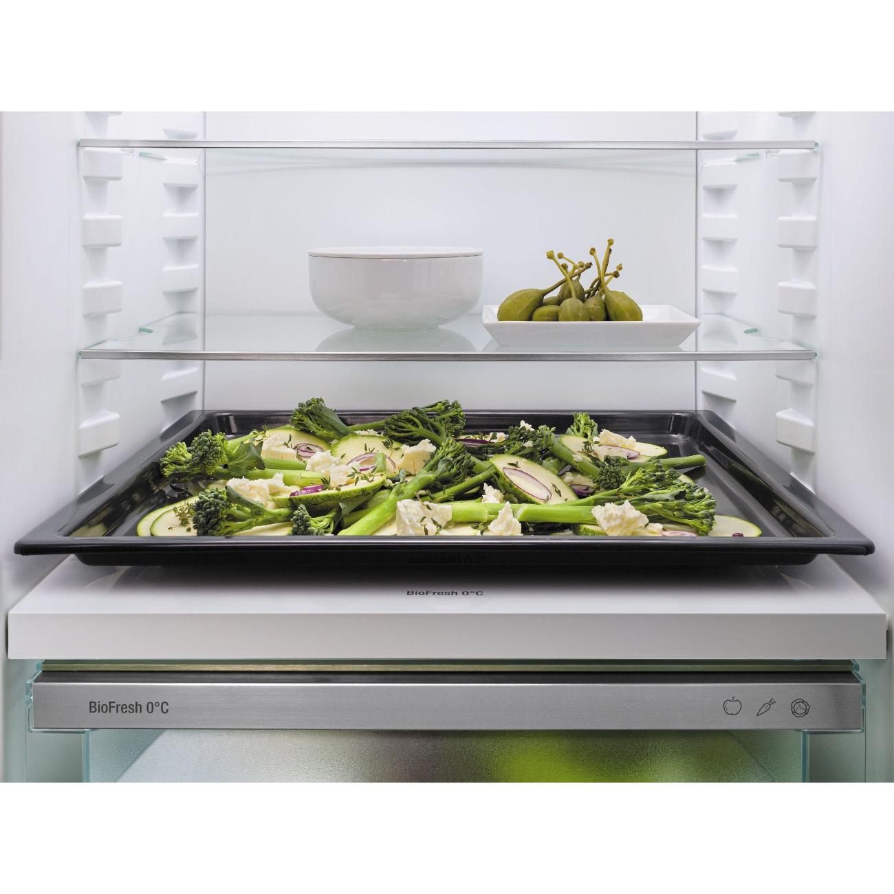 Оснащена пятью основными полками, четыре из которых регулируются по высоте, тремя полками на двери и ящиком для овощей и фруктов. Полки изготовлены из закаленного стекла. Предусмотрено наличие полки для бутылок и подставки для яиц. Для размораживания камеры используется капельный способ. В зоне свежести регулируется уровень влажности и температуру.