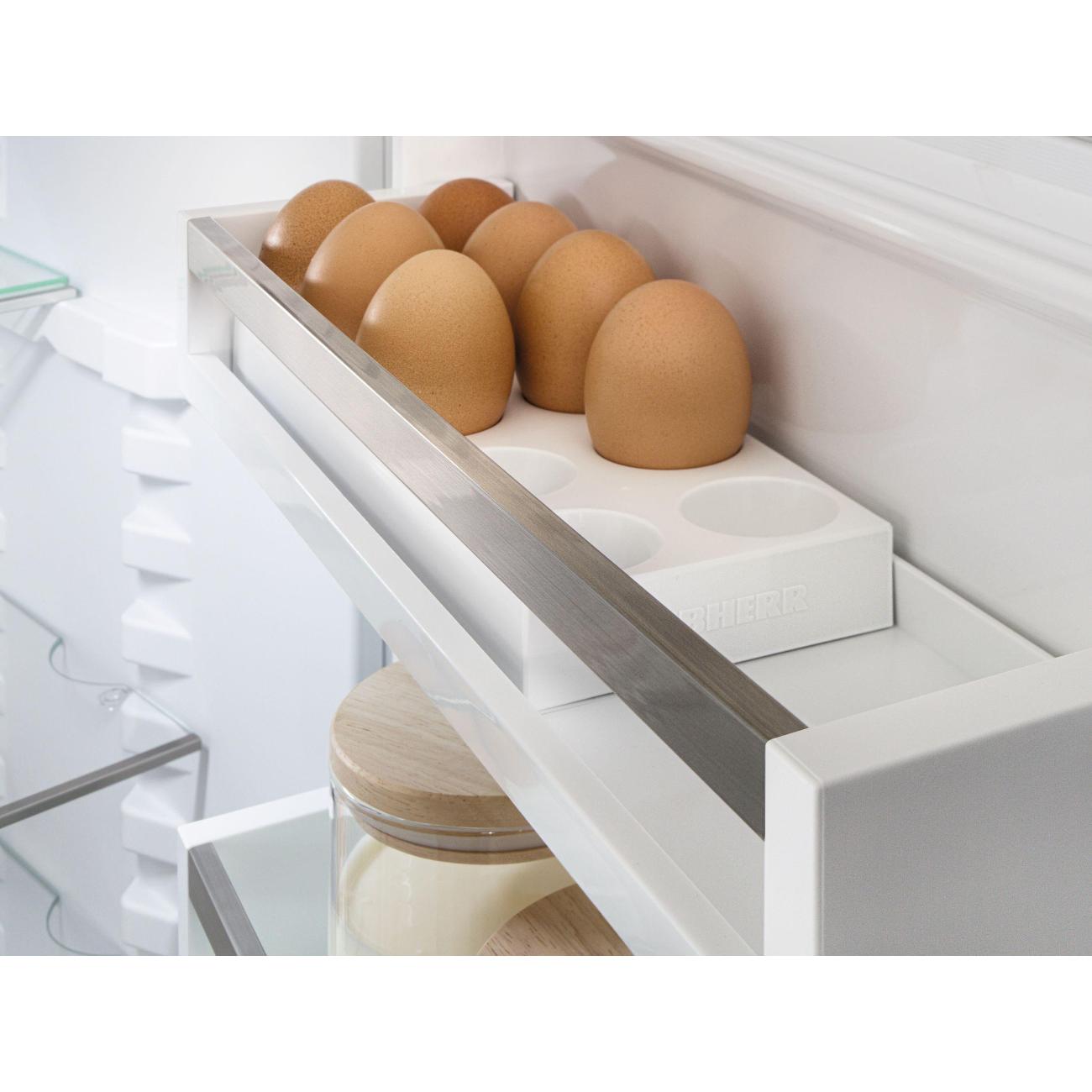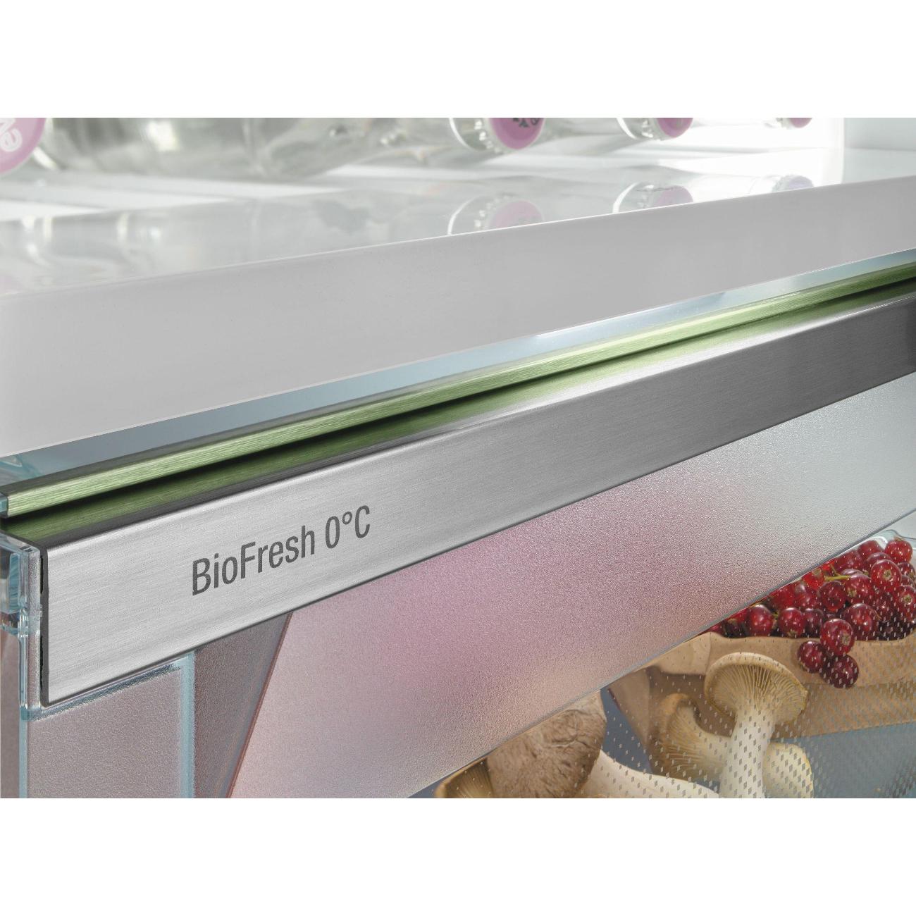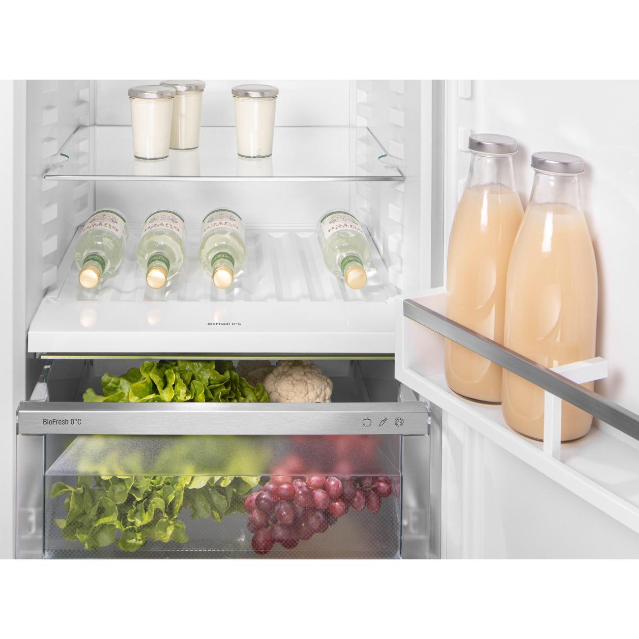 Оснащена пятью основными полками, четыре из которых регулируются по высоте, тремя полками на двери и ящиком для овощей и фруктов. Полки изготовлены из закаленного стекла. Предусмотрено наличие полки для бутылок и подставки для яиц. Для размораживания камеры используется капельный способ. В зоне свежести регулируется уровень влажности и температуру.
