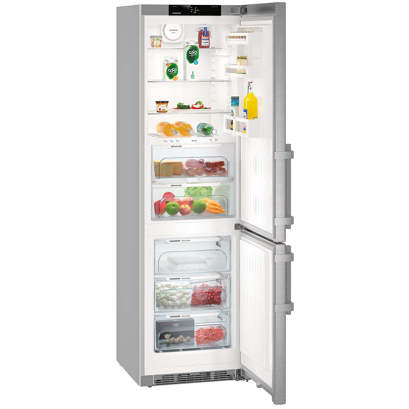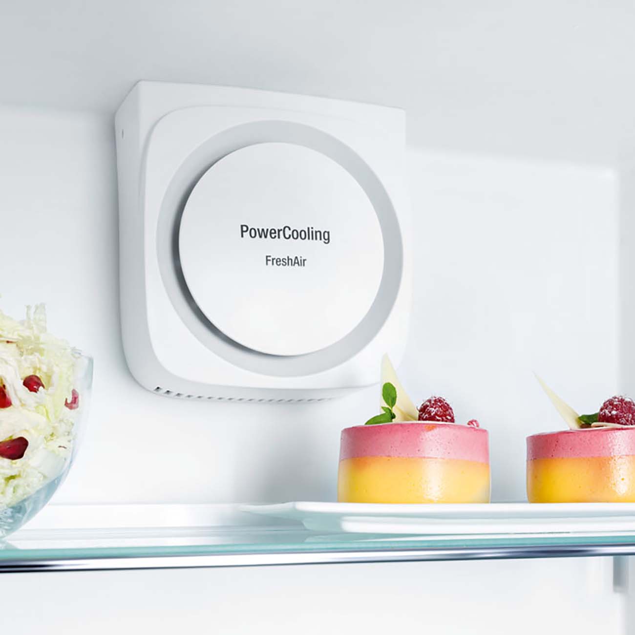 Кроме традиционных стеклянных полок и «карманов» на дверце, холодильный отсек оснащён зоной свежести BioFresh, состоящей из двух контейнеров. Они предназначены специально для фруктов и овощей и охлаждённого мяса или рыбы. Боксы легко выдвигаются на телескопических направляющих. Вентилятор равномерно распределяет прохладный воздух, фильтр с активированным углём FreshAir устраняет неприятные запахи.