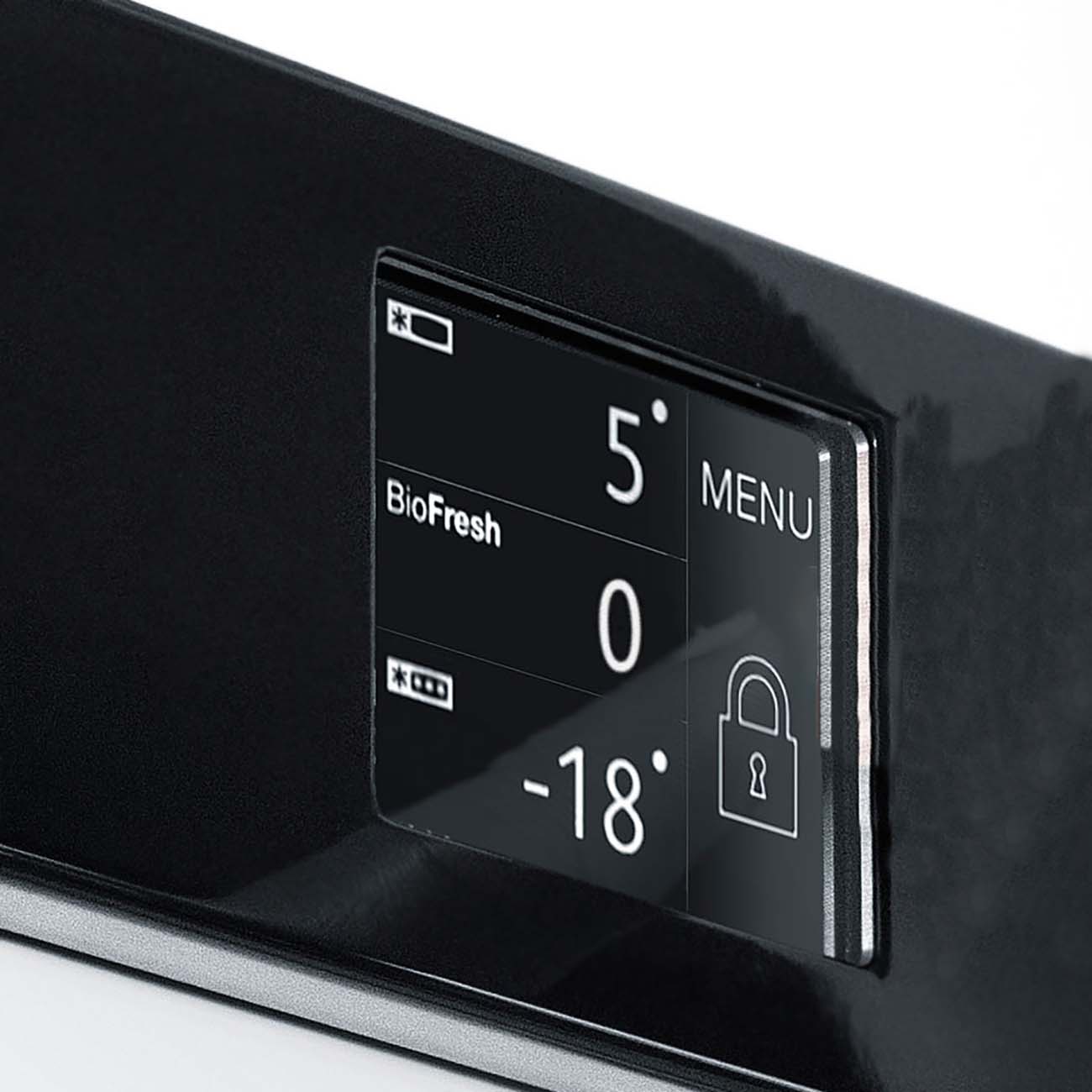 У этой модели удобное электронное управление. Встроенный сенсорный дисплей предоставит доступ ко всем настройкам и информации о работе прибора. Режимы SuperCool и SuperFrost пригодятся при крупной загрузке свежих припасов.
