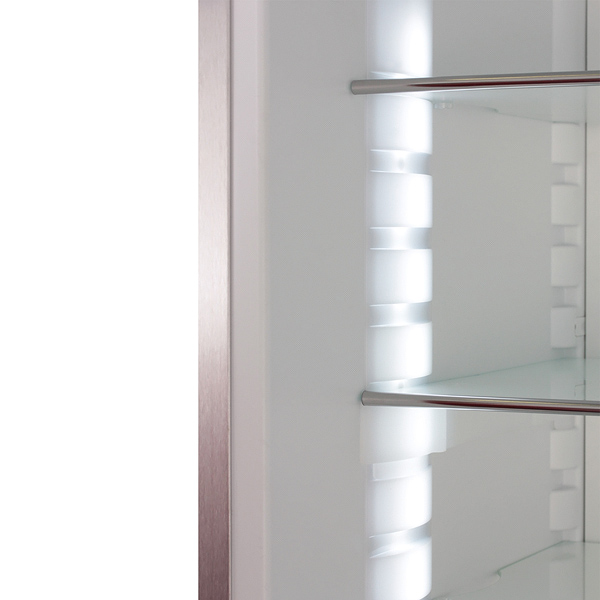 Яркие светодиоды освещают и морозильную камеру, и холодильное отделение. Они экономно расходуют электричество, не нагревают воздух внутри холодильника. Их свет поможет быстро найти необходимые продукты.