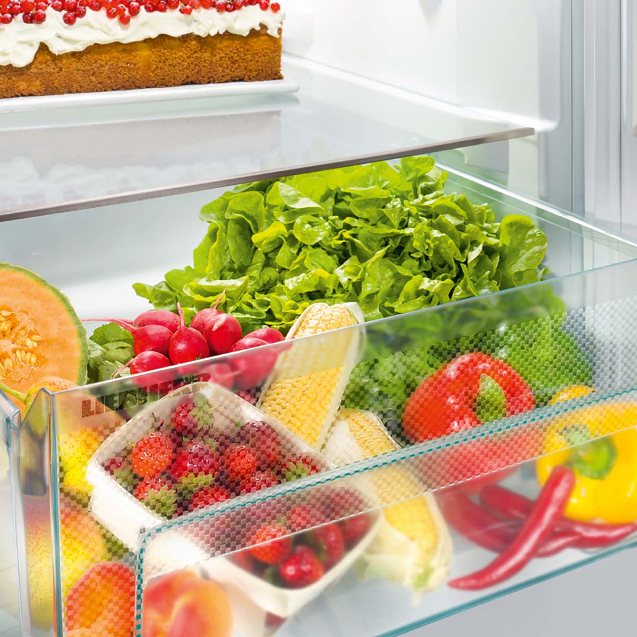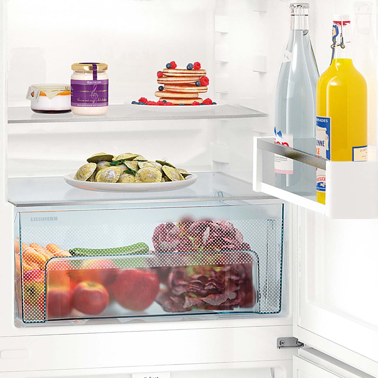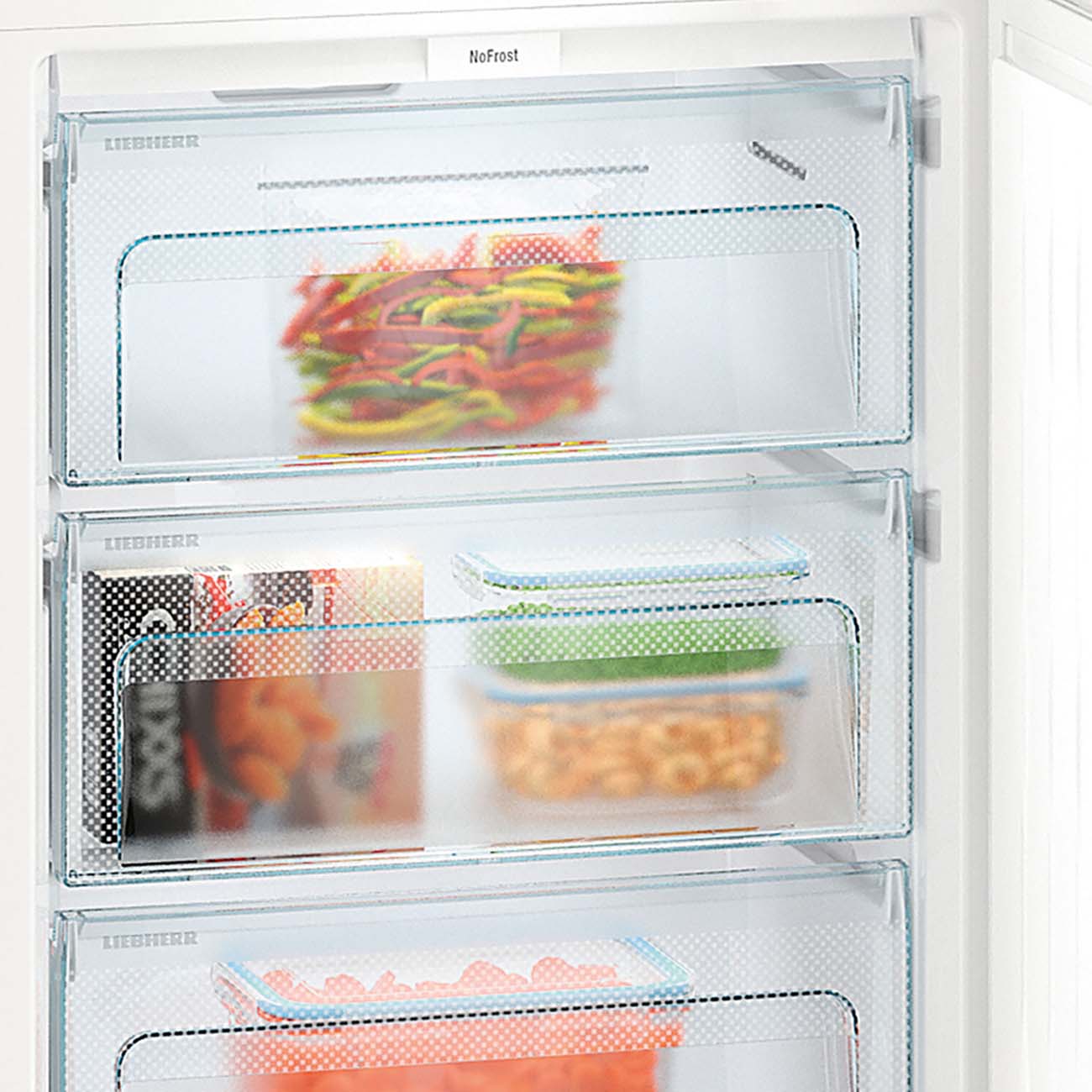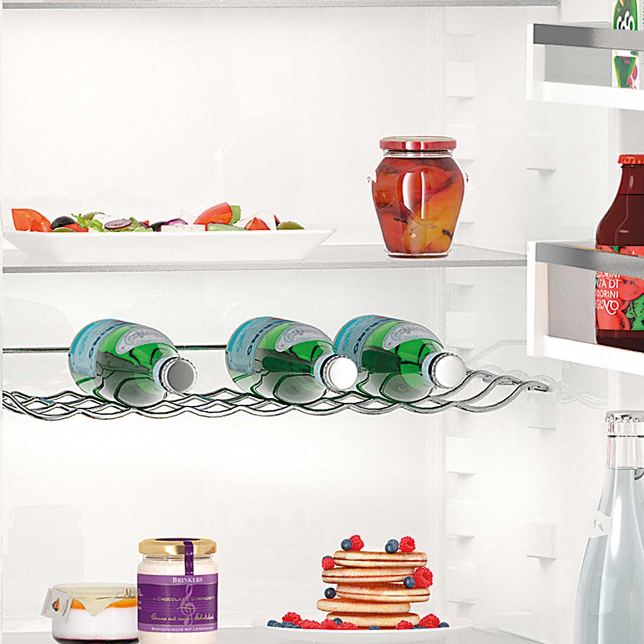 Холодильное отделение укомплектовано четырьмя полками, причём три из них можно переставлять по высоте, адаптируя пространство под текущие нужды. Кроме того, есть «карманы» на двери, контейнер для фруктов и овощей и подвес для хранения бутылок в горизонтальном положении. В морозилке – три ящика с прозрачной фронтальной панелью, благодаря которой будет легко сориентироваться в содержимом. Прилагаются подставка для яиц и ванночка для приготовления льда.