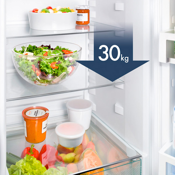 На трёх регулируемых по высоте полках легко поместится как небольшая супница, так и тяжёлый казан с пловом. Прочное стекло выдержит до 30 кг веса. Бутылки с молоком, яйца и прочие соусы без труда расположатся на дверце.