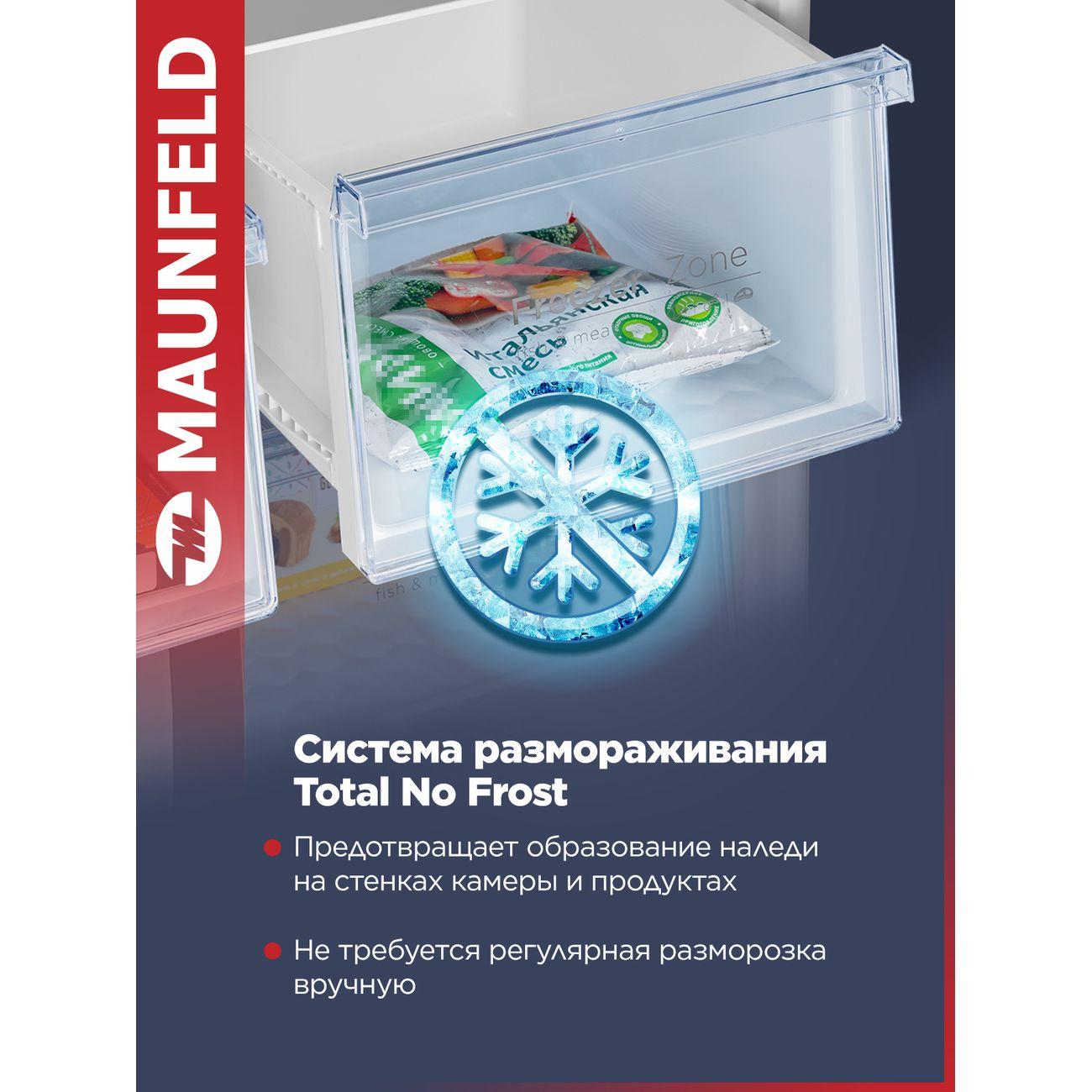Холодильник Maunfeld MFF181NFW, белый — четырехдверная модель общим объемом 489 л. В основе системы охлаждения — инверторный компрессор и современный озонобезопасный хладагент R600А. В год прибор потребляет 369 кВт*ч, что соответствует классу А++. Максимальный уровень шума — 42 дБ.
