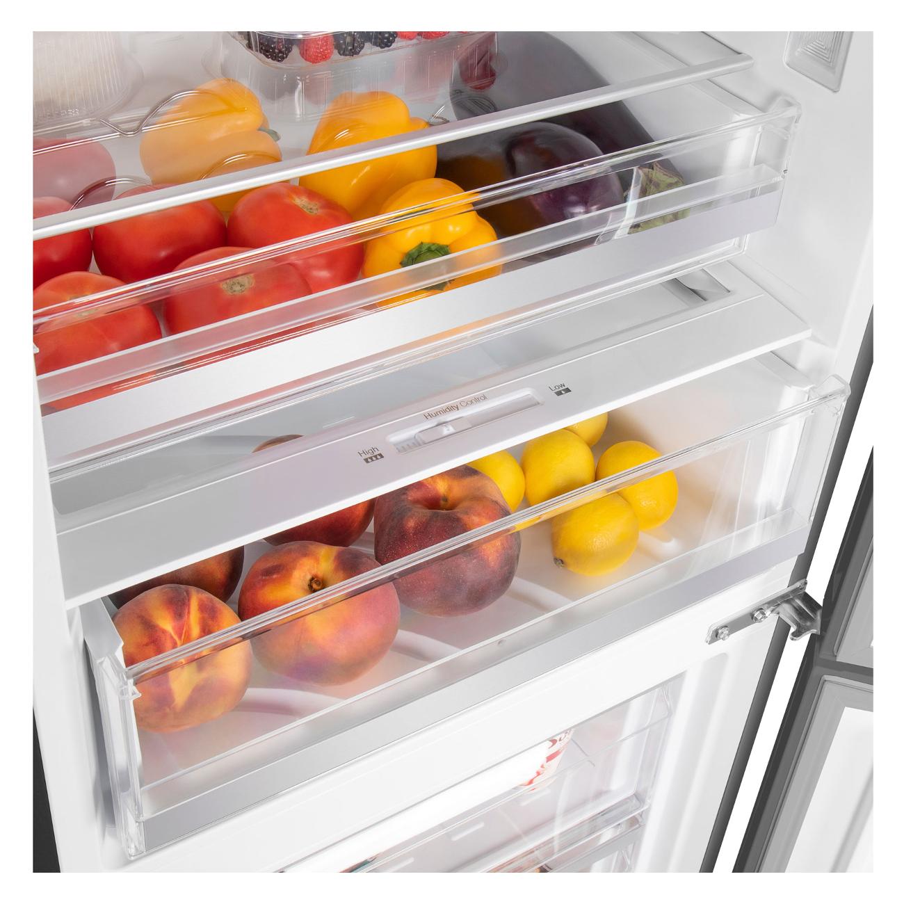 Холодный воздух внутри распределяется равномерно благодаря встроенному вентилятору. Пространство для хранения продуктов оптимизировано, так как все элементы регулируются и передвигаются так, как вам нужно. Полки изготовлены из прочного закаленного стекла.
