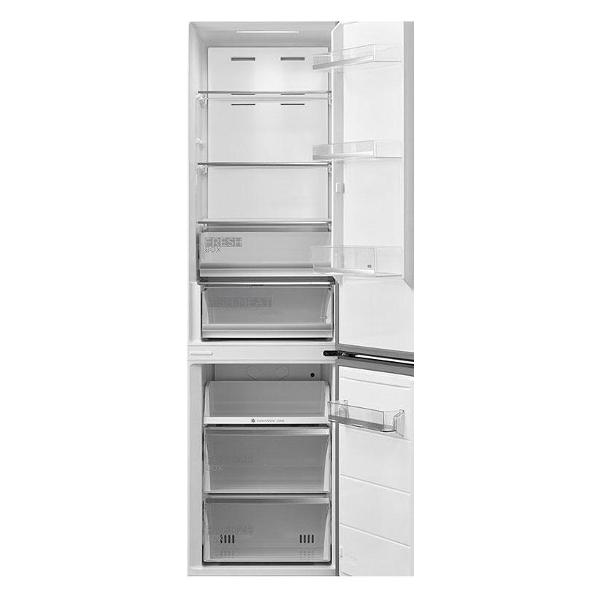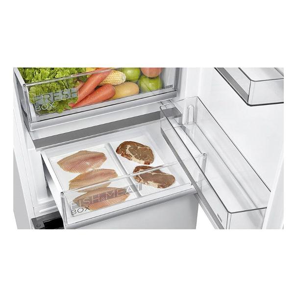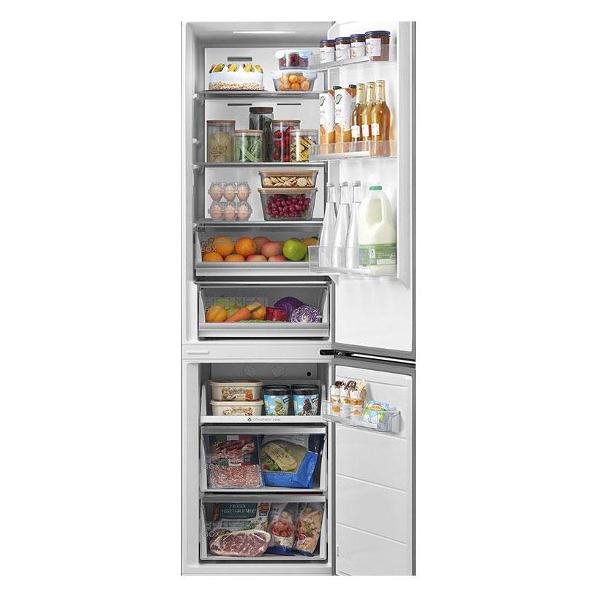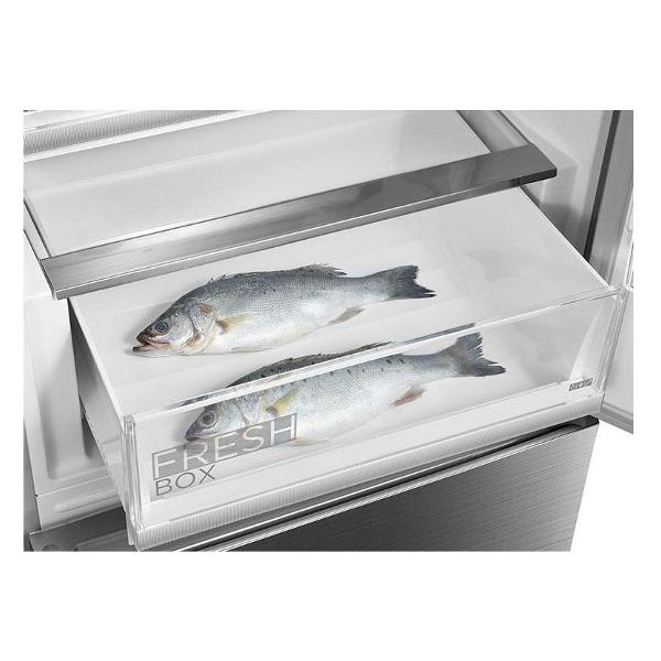 Холодильник стабильно функционирует при температуре 16-43°С. Устройство относится к классу энергоэффективности A++, так как потребляет всего 260 кВт*ч в год. Особенность модели — трехсторонняя LED-подсветка, которая затрагивает большую площадь, позволяя легко найти любой продукт. Уровень шума прибора не превышает 38 дБ. В холодильной камере находятся три полки из прочного закаленного стекла и ящик для овощей и фруктов. Дверца дополнена тремя полочками из пластика. Морозильная камера состоит из трех отделений и двух ящиков.