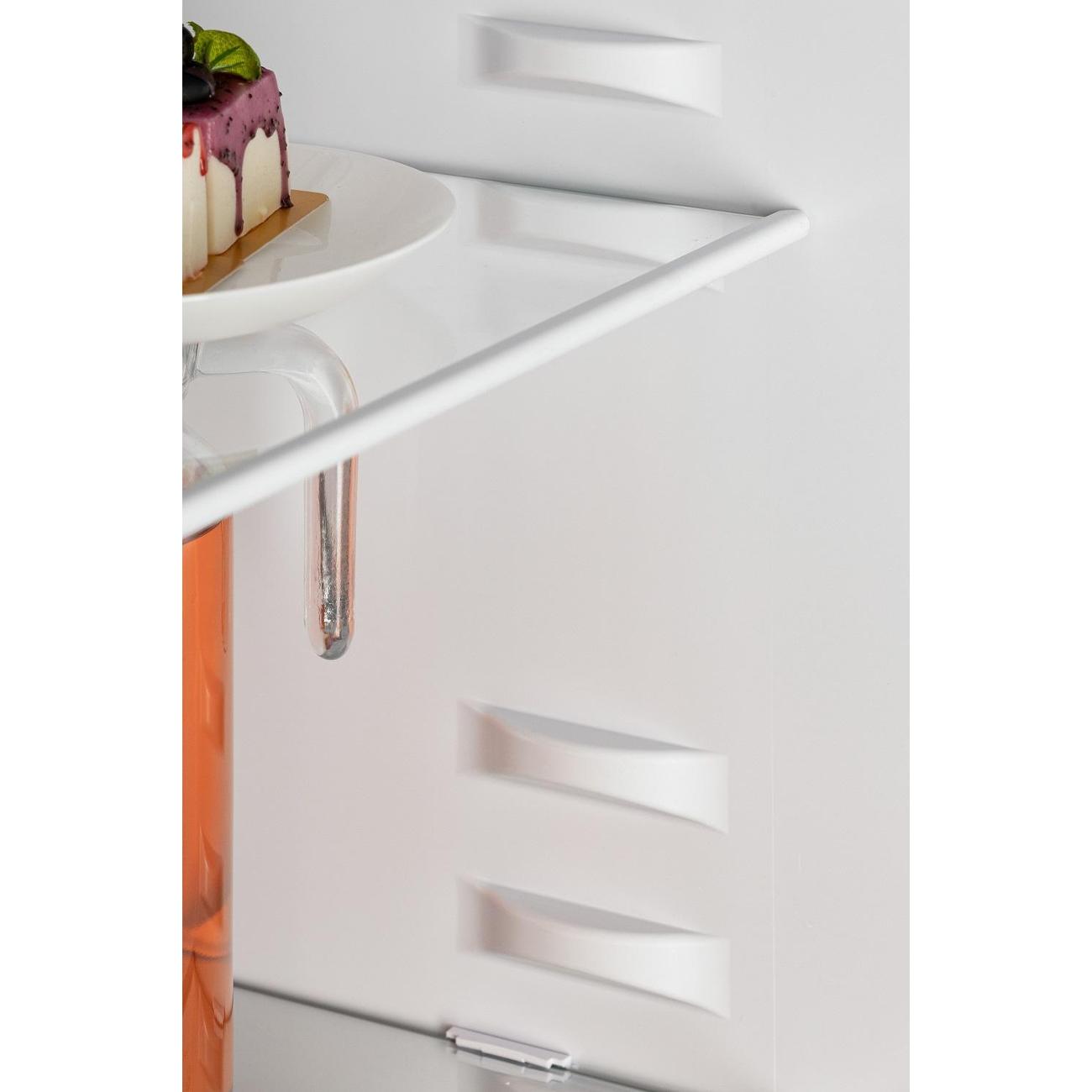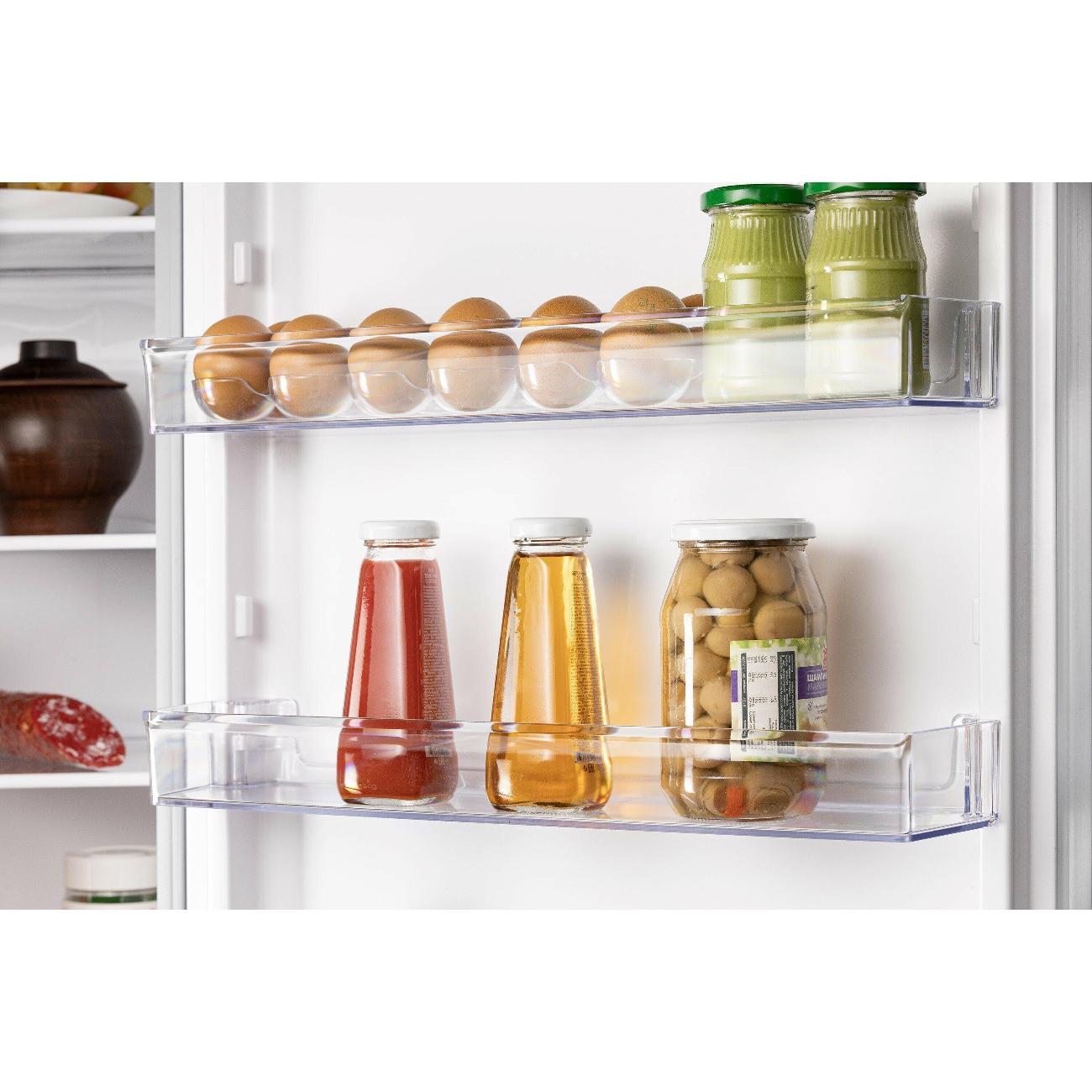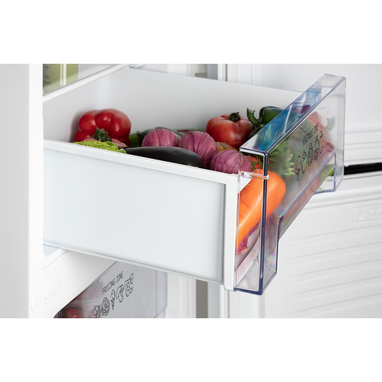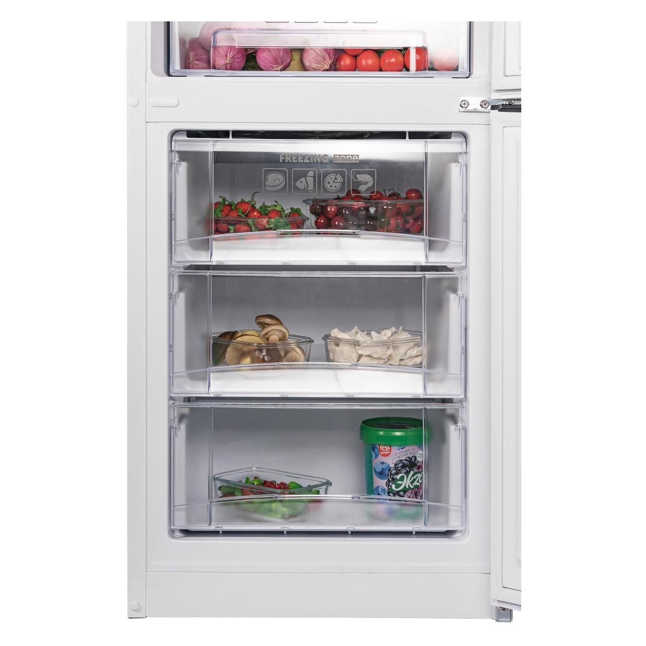 Общий объем холодильной камеры составляет 238 л. Благодаря капельной разморозке осуществляется плавное оттаивание наледи со стенок. На пять полок из закаленного стекла помещается объемная посуда. Пластиковые балконы на двери рассчитаны для вытянутых бутылок. Специальный отдел для овощей и фруктов способствует длительному сохранению свежести. За счет встроенной светодиодной лампы гарантируется получение оптимальной степени освещения. Управление моделью производится посредством электромеханического переключателя.