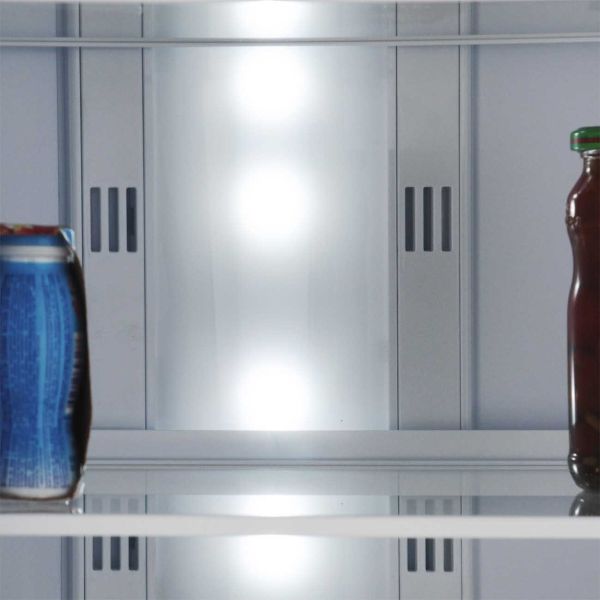 Из четырех стеклянных полок в холодильном отделении три можно переставлять по высоте. Кроме того, оснащение включает два контейнера для фруктов и овощей и четыре кармана на двери, верхний — закрытый, он будет удобен для хранения продуктов, легко впитывающих посторонние запахи. Внутреннее пространство освещается светодиодной панелью.