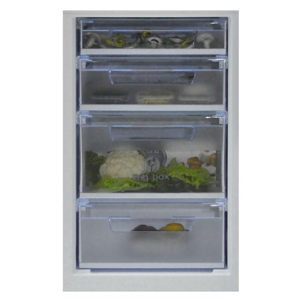 Холодильная камера (220 л) оборудована четырьмя полками, выполненными из закаленного стекла. Три из них переставляются по высоте, четвертая служит крышкой двух контейнеров для фруктов и овощей. На двери — четыре кармана, верхний снабжен крышкой. Температура может поддерживаться в диапазоне от 0°C до 10°C. Морозильное отделение (124 л) оснащено четырьмя выдвижными пластиковыми ящиками и способно обработать до 10,5 кг продуктов в сутки. Один из ящиков — увеличенного объема (Big Box) для «крупногабаритных» припасов. Условия хранения — не выше -18°C.