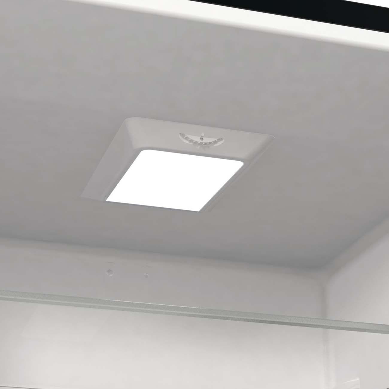 Дверца открывается под прямым углом. За счёт этого вы можете легко выдвинуть все полки и контейнеры, в том числе ящик CrispZone, предназначенный для хранения недавно купленных фруктов и овощей. LED-освещение поможет быстро отыскать продукты, которые вам нужны в данный момент. Уровень шума не превышает 38 дБ – это ниже средней громкости обычного разговора, поэтому устройство не станет источником дискомфорта для тех, кто живёт в квартире.