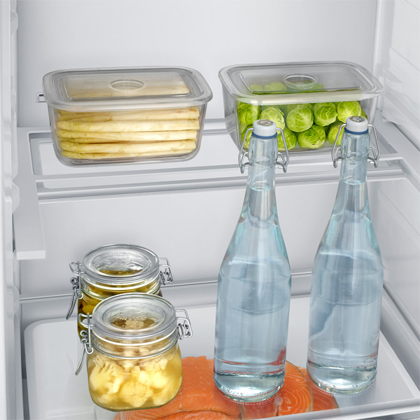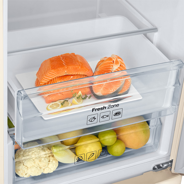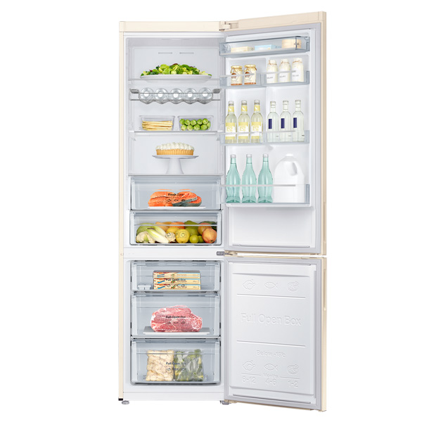 Общий объем холодильника Samsung RB37J5240EF составляет 367 литров, а морозильная камера вмещает до 98 л. Для хранения мяса и рыбы предусмотрено специальное отделение, в котором поддерживается оптимальная температура. Все отсеки имеют изображения для удобного расположения продуктов. Морозильная камера оснащена полностью выдвижным ящиком, что позволяет хранить крупные куски мяса и птицы и легко их доставать.