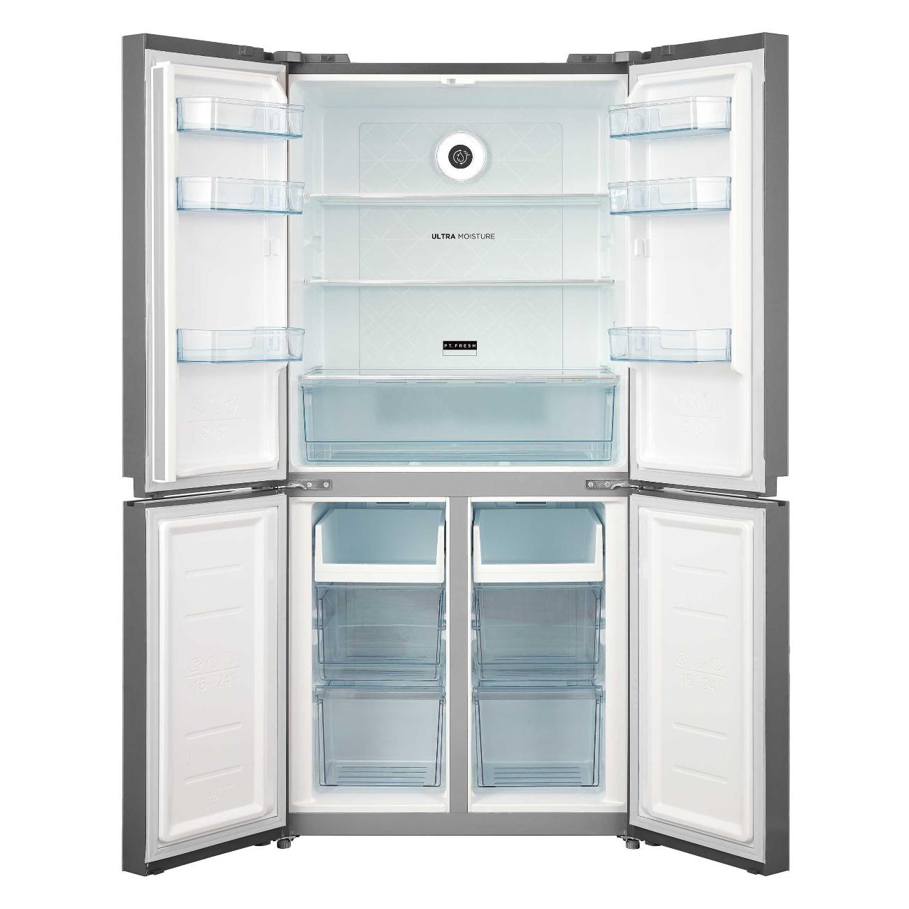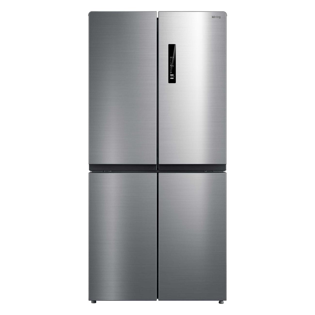 Холодильник Side-by-Side Korting KNFM 81787 X, серебристый оснащен четырьмя распашными дверями. Общий объем прибора составляет 456 л, из них 303 л — холодильная камера и 153 л — морозильная. Обе размораживаются автоматически по технологии No Frost.