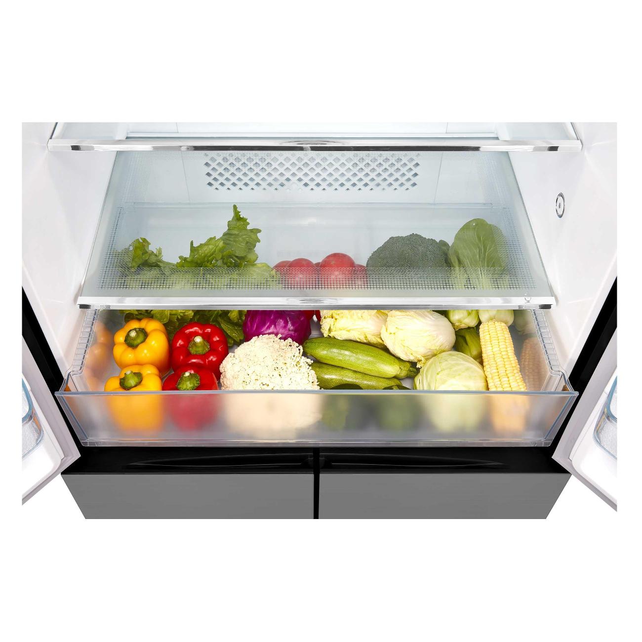 В холодильном отделении расположены три стеклянные полки, широкий контейнер для фруктов и овощей и шесть карманов на дверях. В комплекте — подставка для яиц. Одинаковые условия хранения во всех уголках обеспечивает динамическая система охлаждения. Светодиодные элементы создают мягкое и при этом яркое освещение. Фильтр PT Fresh освежает воздух, препятствует возникновению неприятного запаха. В морозилке — шесть ящиков, два из которых полуоткрытые. В сутки можно заморозить до 10 кг свежих припасов.