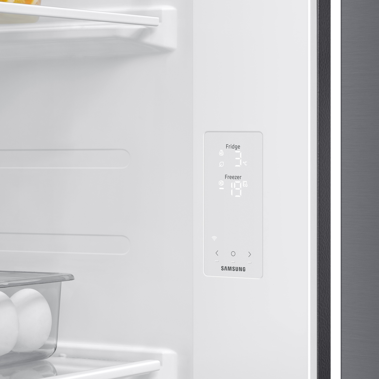 В холодильной камере объемом 418 л расположены два ящика для овощей, четыре регулируемых по высоте полки и пять полок на двери. Предусмотрены индикация температуры и освещение. Морозильная камера с боковым расположением оснащена двумя ящиками и четырьмя полками, индикацией и LED-освещением. Встроены функции суперохлаждения, суперзамораживания и ледогенератор. При отключении питания холодильник сохраняет продукцию в течение 10 ч. Звуковой сигнал оповестит об открытой двери. Цвет — нержавеющая сталь. Вес — 98 кг. Уровень шума не превышает 38 дБ. Хладагент R — 600a. Корпус изготовлен из металла, ящики — из пластика.