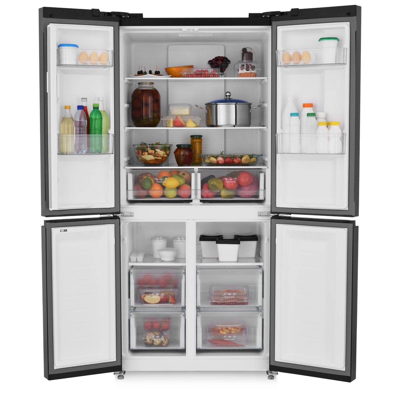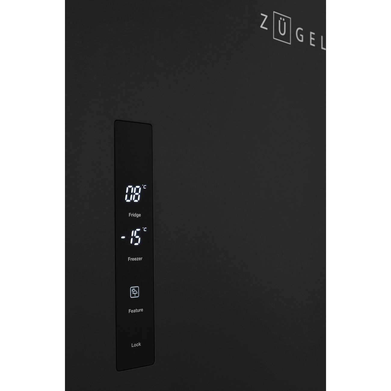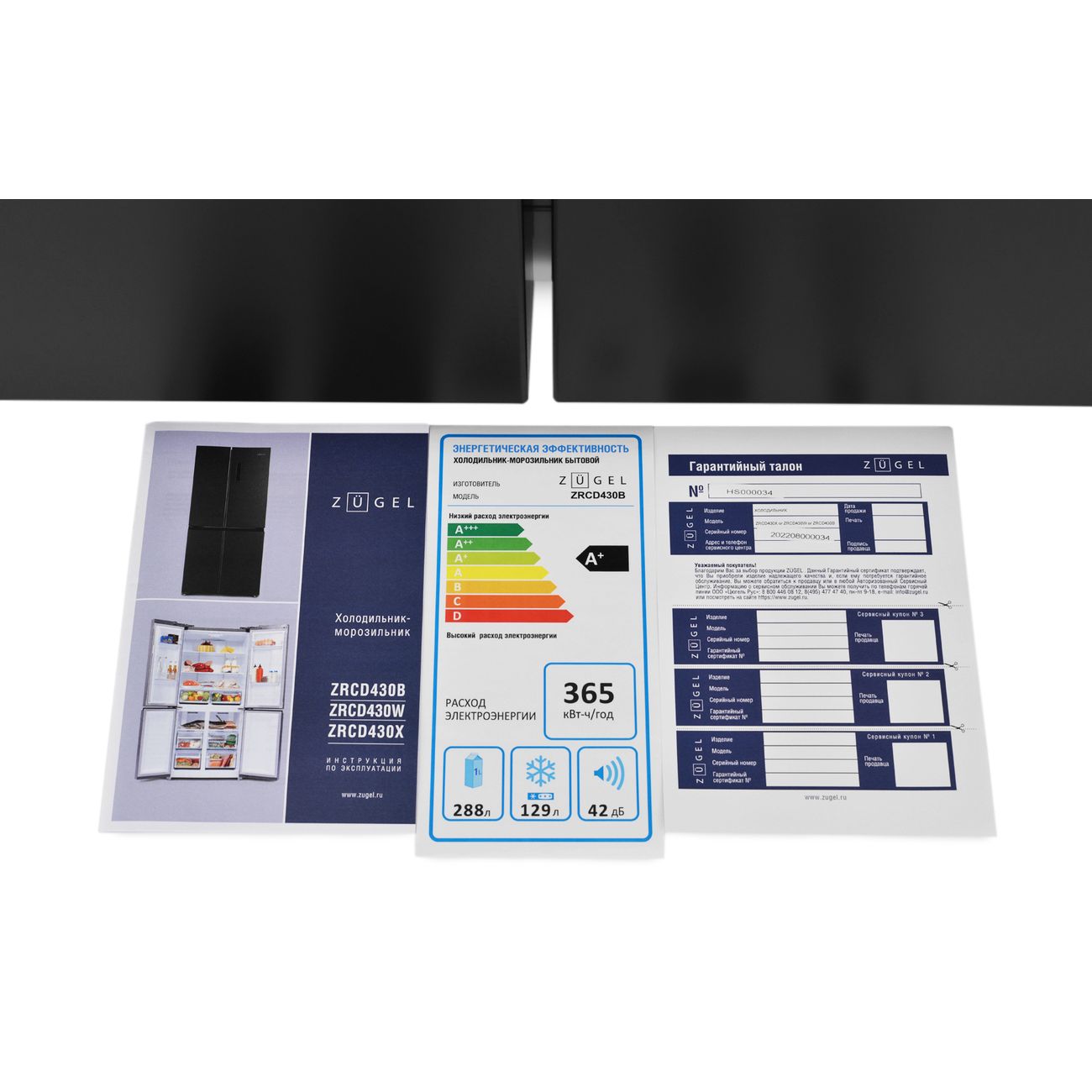 Холодильник Side-by-Side Zugel ZRCD430B в корпусе черного цвета оборудован четырьмя распашными дверями. Управление обеспечивает сенсорная панель с LED-дисплеем, на котором отображается текущая температура в обоих отделениях. В прибор заложены режимы «Отпуск», «Суперзамораживание», «Суперохлаждение». В устройстве реализована технология автоматической разморозки No Frost.