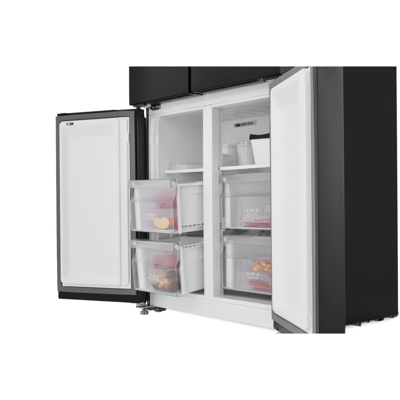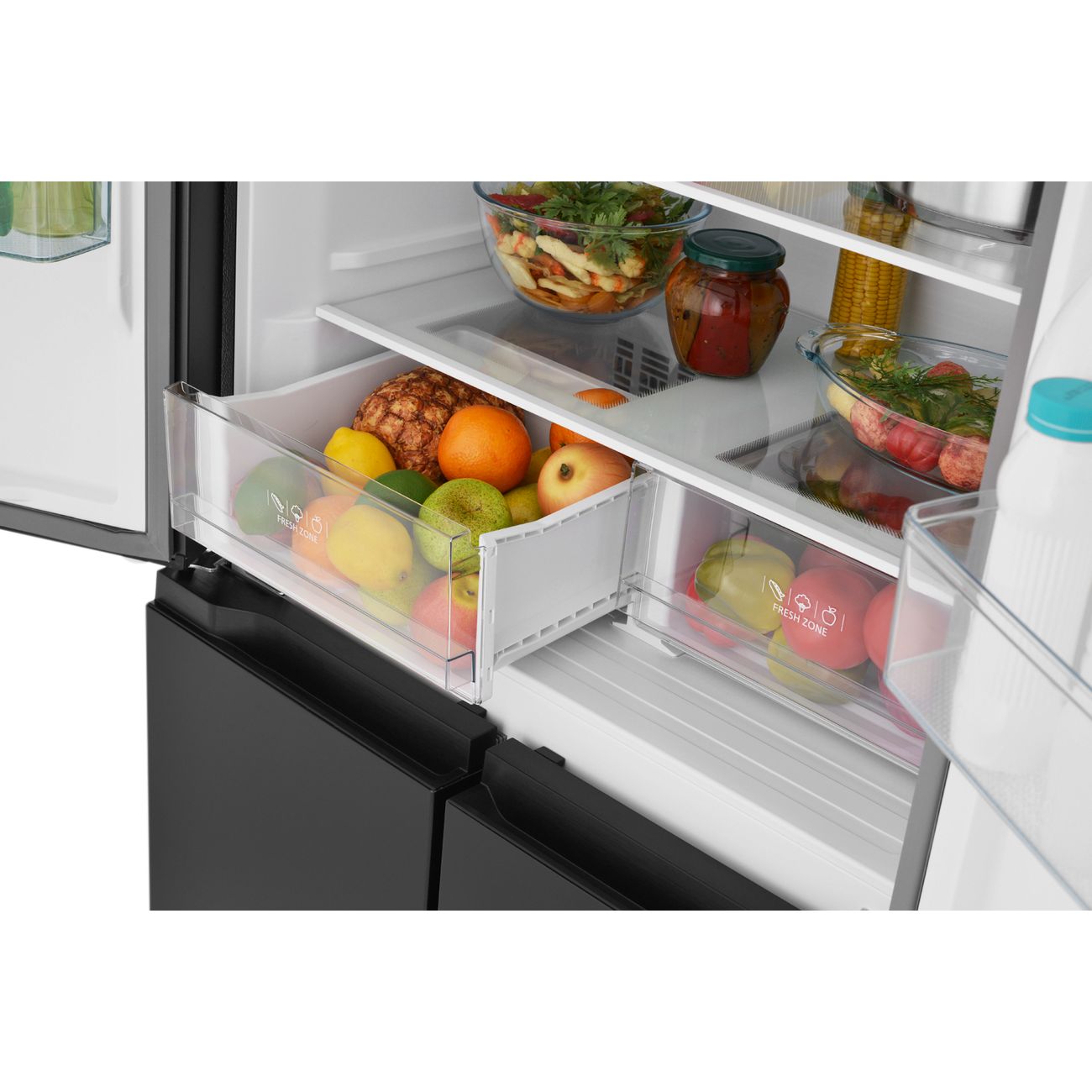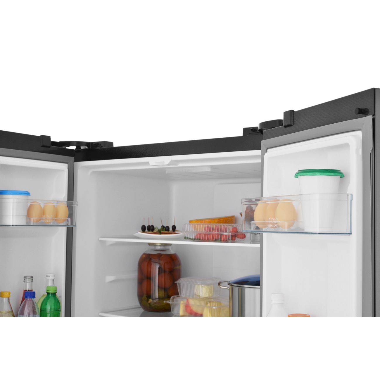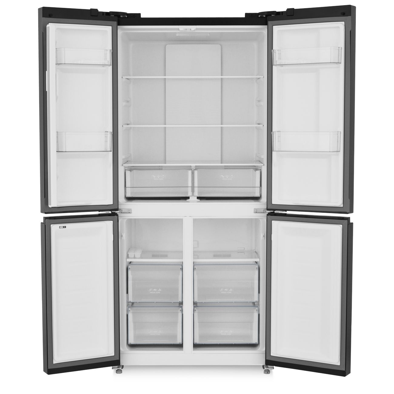 Холодильник Side-by-Side Zugel ZRCD430B в корпусе черного цвета оборудован четырьмя распашными дверями. Управление обеспечивает сенсорная панель с LED-дисплеем, на котором отображается текущая температура в обоих отделениях. В прибор заложены режимы «Отпуск», «Суперзамораживание», «Суперохлаждение». В устройстве реализована технология автоматической разморозки No Frost.