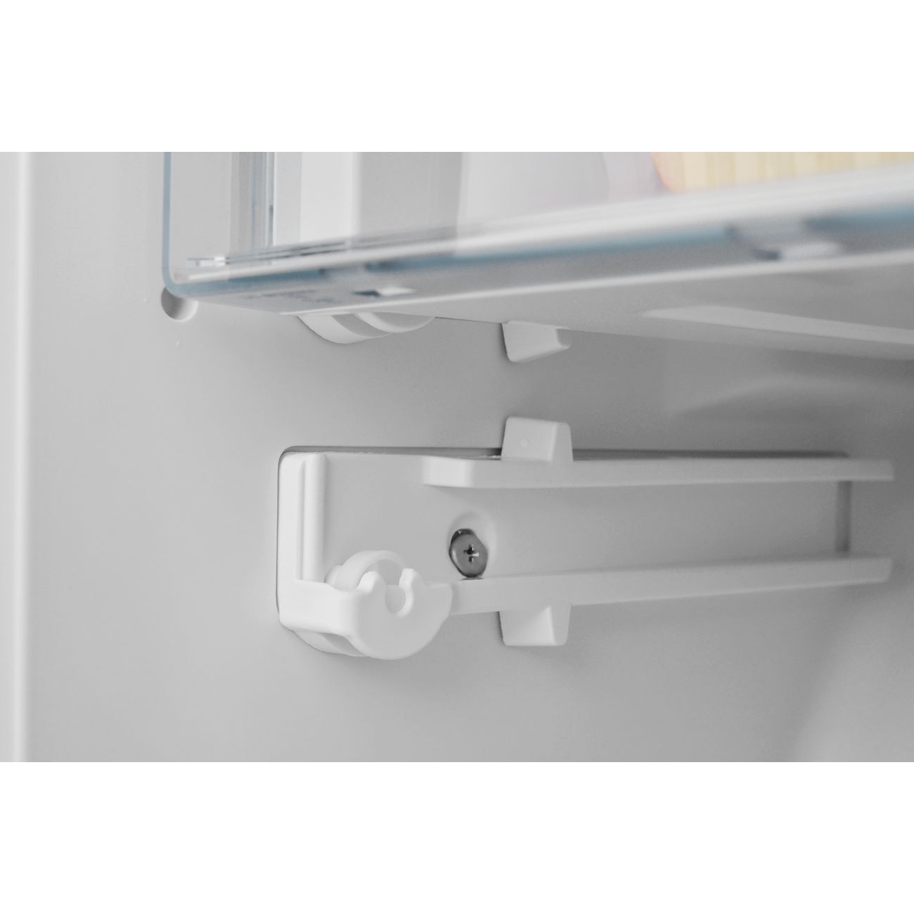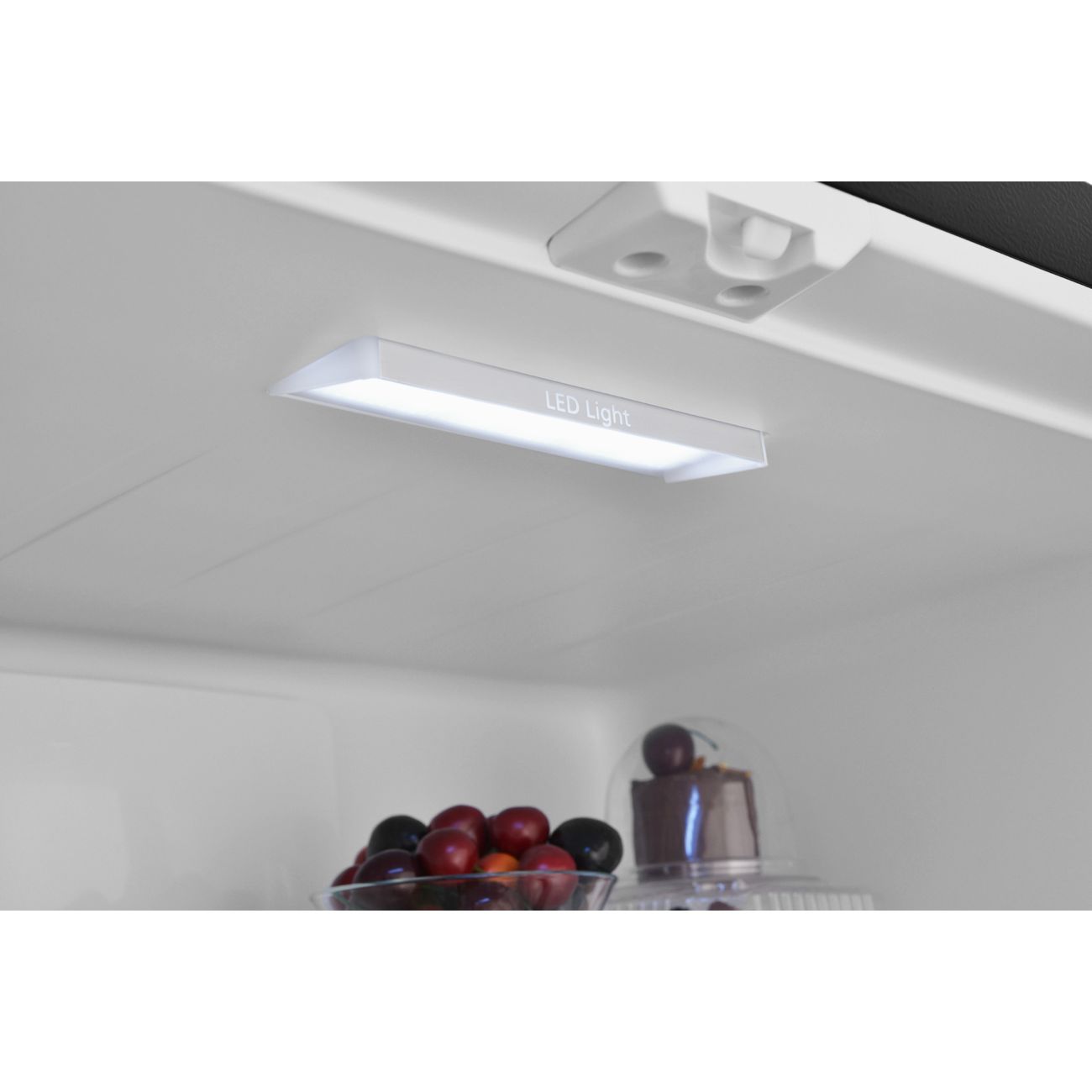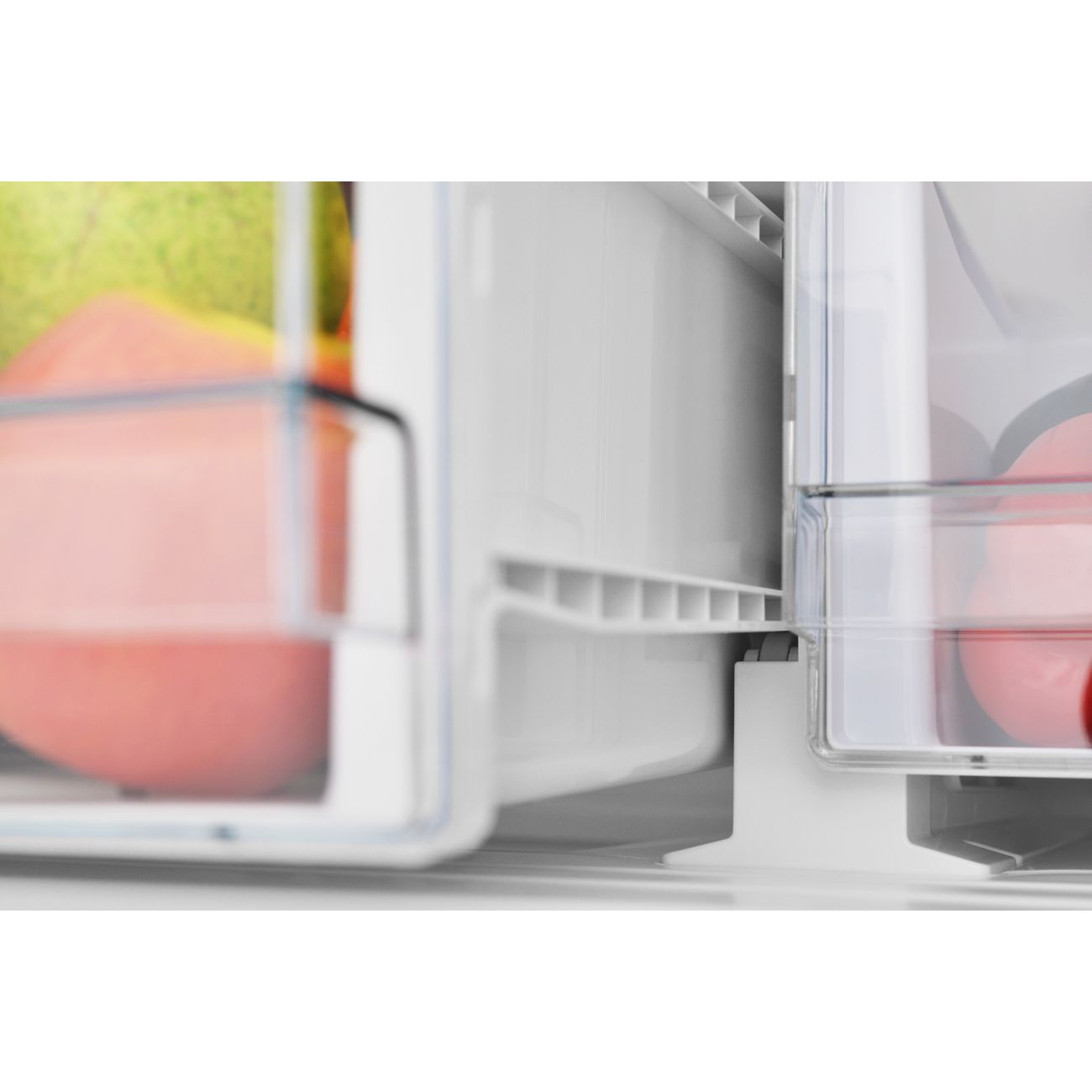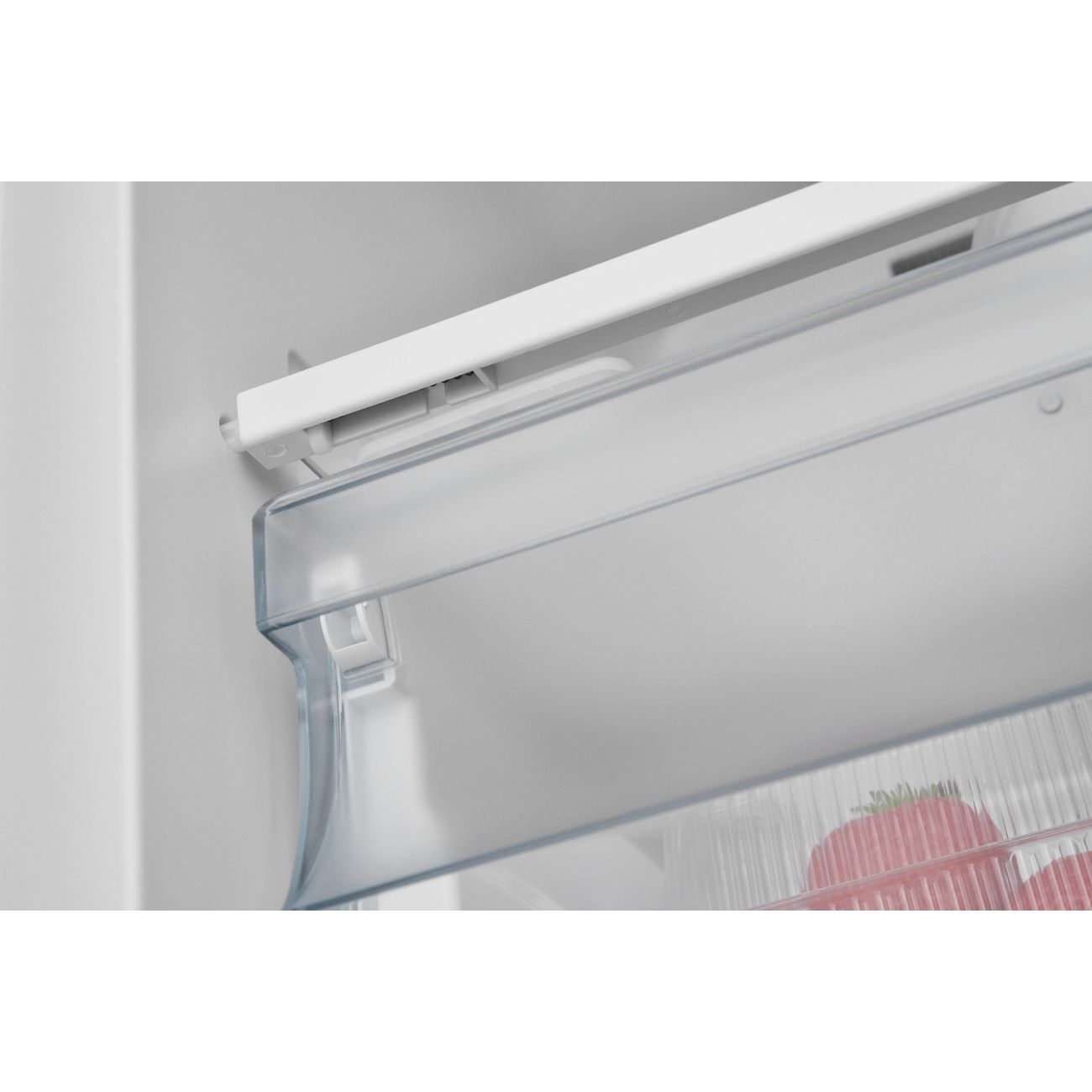 Холодильный отсек вместимостью 306 л оснащен тремя стеклянными полками, одна из них регулируется по высоте, четырьмя пластиковыми дверными карманами и двумя боксами для овощей и фруктов. В набор включены две подставки для яиц на шесть штук каждая. В зоне свежести можно регулировать уровень влажности. Освещение обеспечивают встроенные LED-лампы.