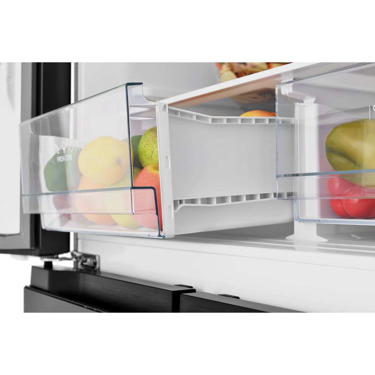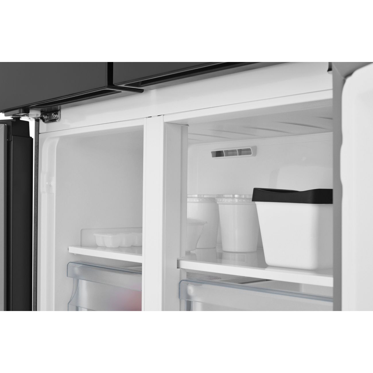 Морозильная камера объемом 176 л расположена внизу, состоит из шести отделений: снабжена четырьмя прозрачными ящиками и двумя полками. В комплекте — контейнер для льда. Производительность камеры — до 12 кг/сутки. В этой модели используется экологически безвредный хладагент R600A.