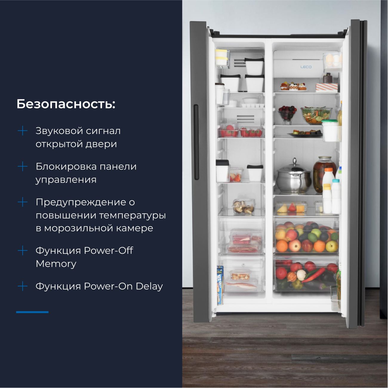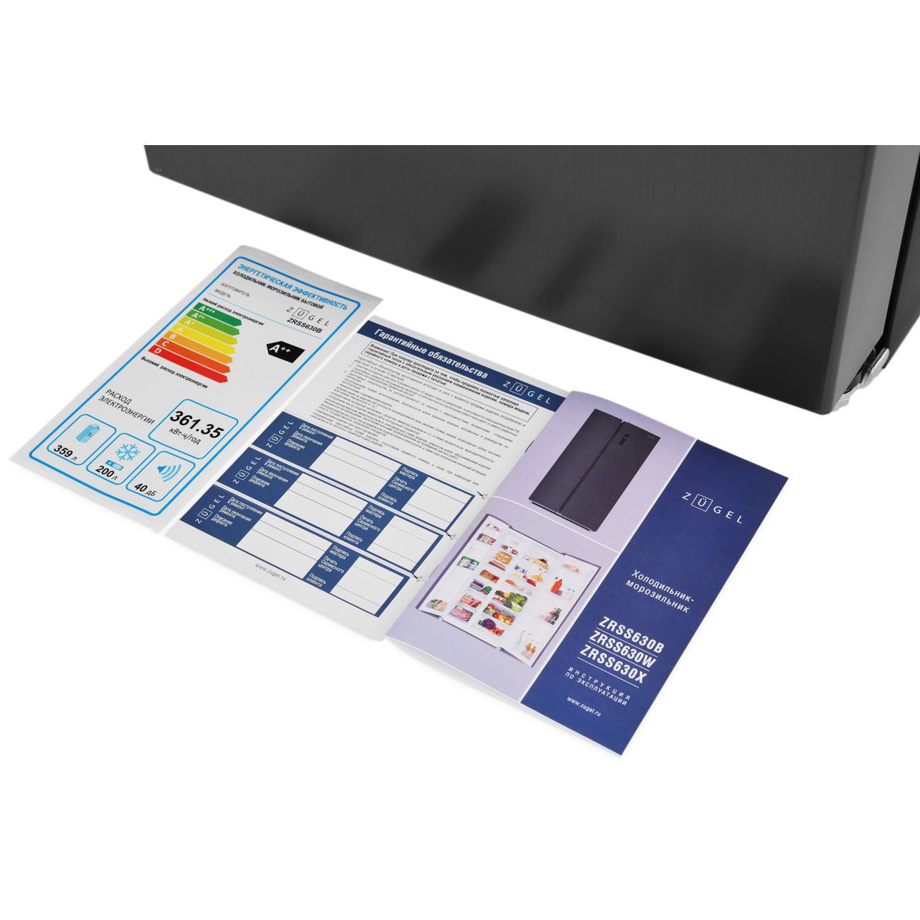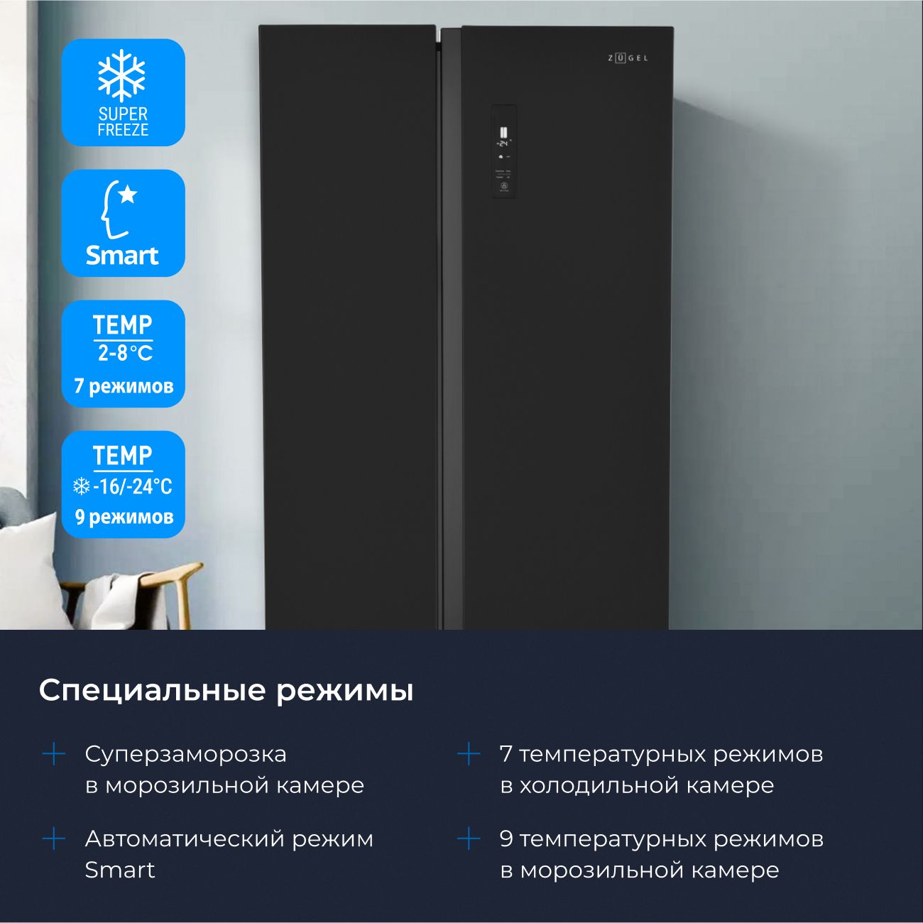 Холодильник (Side-by-Side) ZUGEL ZRSS630B размером 177х91,2х70,4 см и весом 86 кг отличается покрытием из высокопрочного металла черного цвета. Две двери, открывающиеся налево и направо, дополнены внутренними ручками. На лицевой панели расположен LED-дисплей с сенсорным блоком управления. Световые индикаторы включения и температуры, звуковой сигнал обеспечивают удобство эксплуатации. Доступен режим суперзамораживания.
