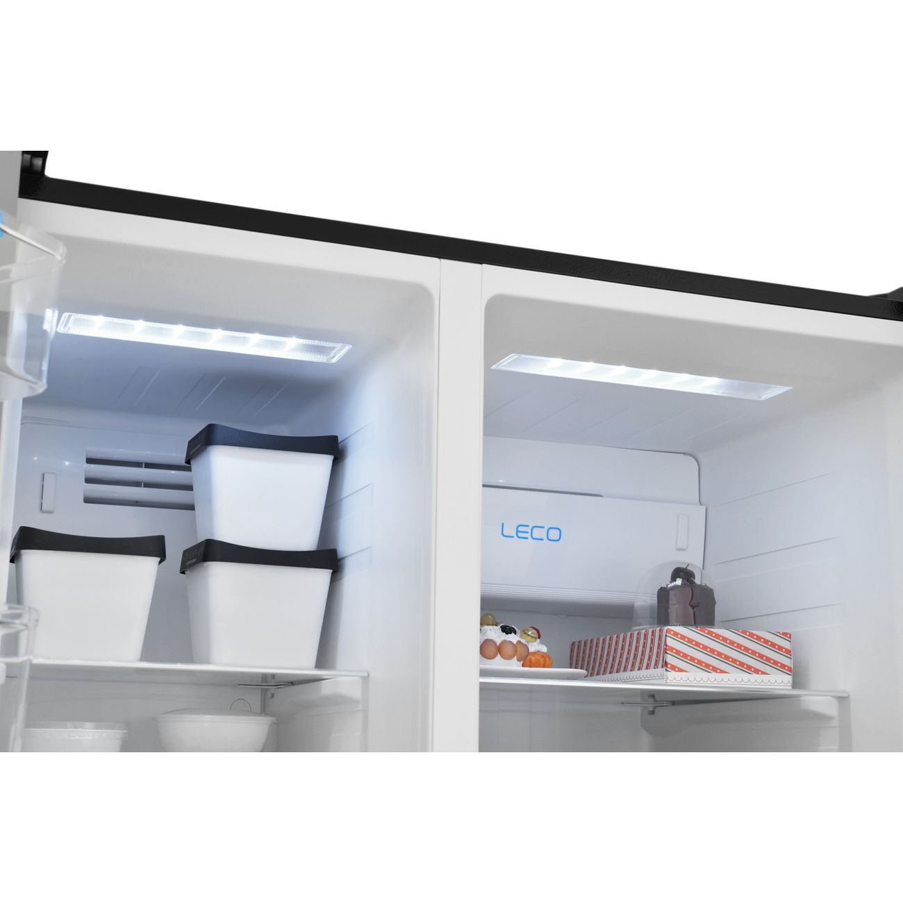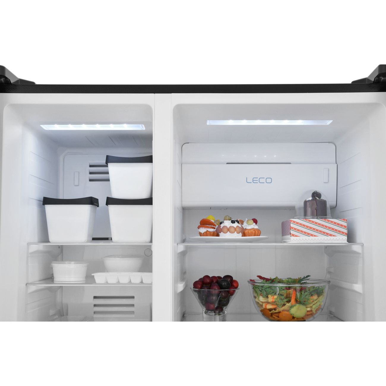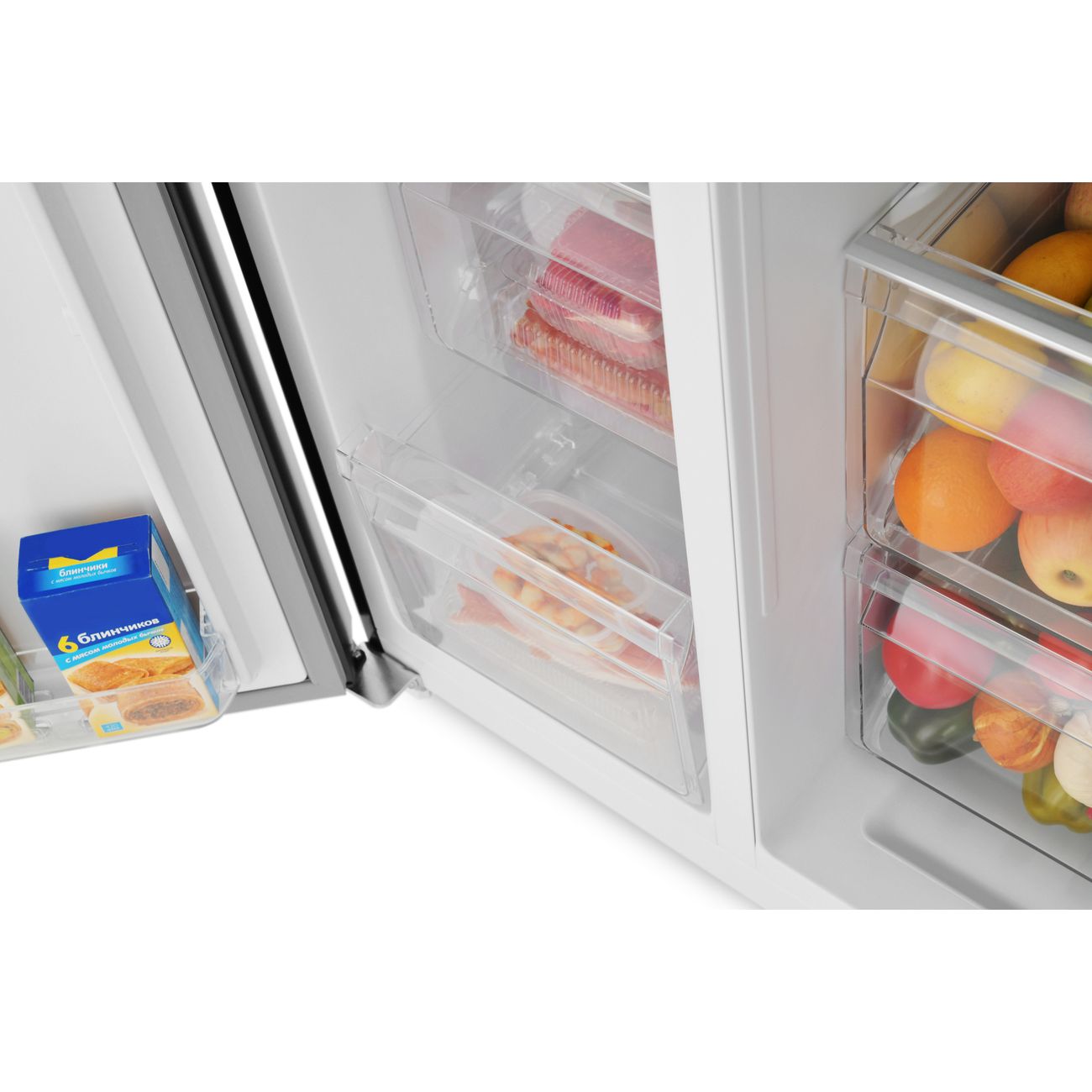 Холодильник (Side-by-Side) ZUGEL ZRSS630B размером 177х91,2х70,4 см и весом 86 кг отличается покрытием из высокопрочного металла черного цвета. Две двери, открывающиеся налево и направо, дополнены внутренними ручками. На лицевой панели расположен LED-дисплей с сенсорным блоком управления. Световые индикаторы включения и температуры, звуковой сигнал обеспечивают удобство эксплуатации. Доступен режим суперзамораживания.